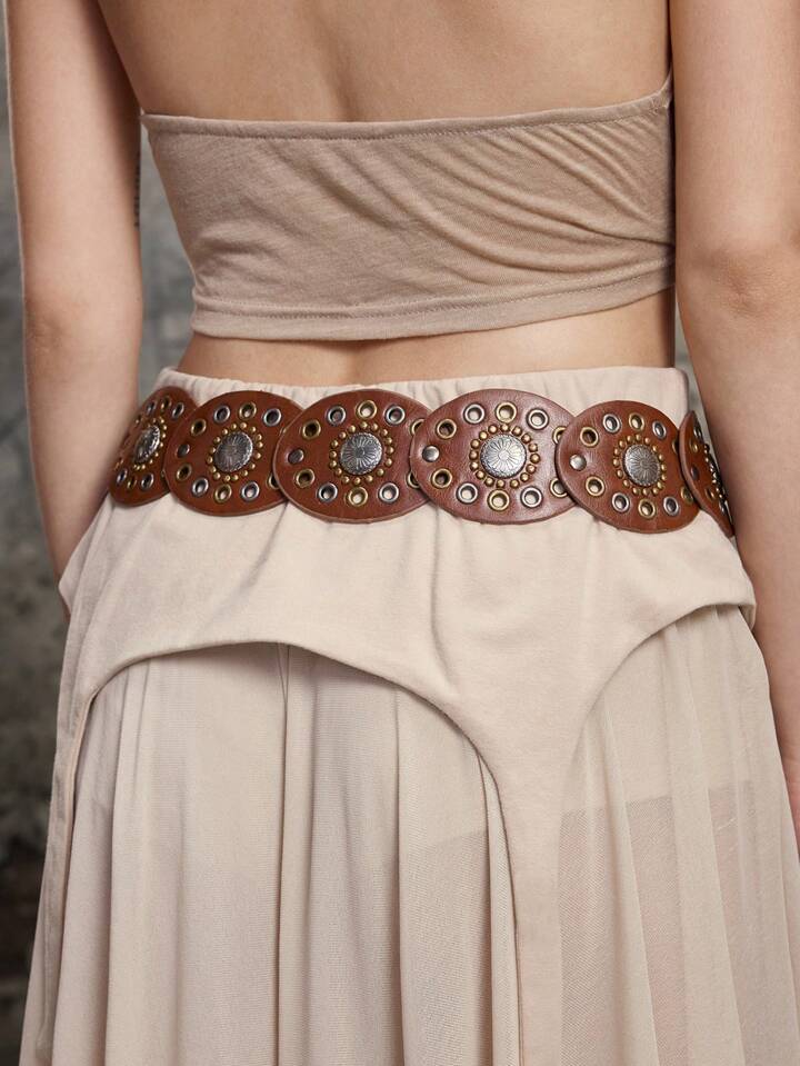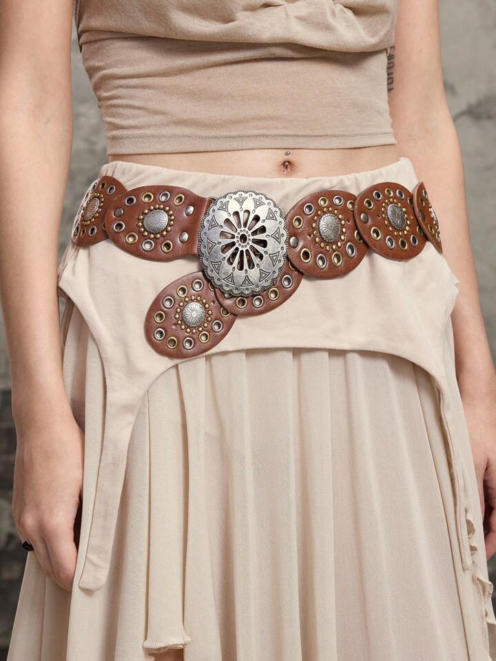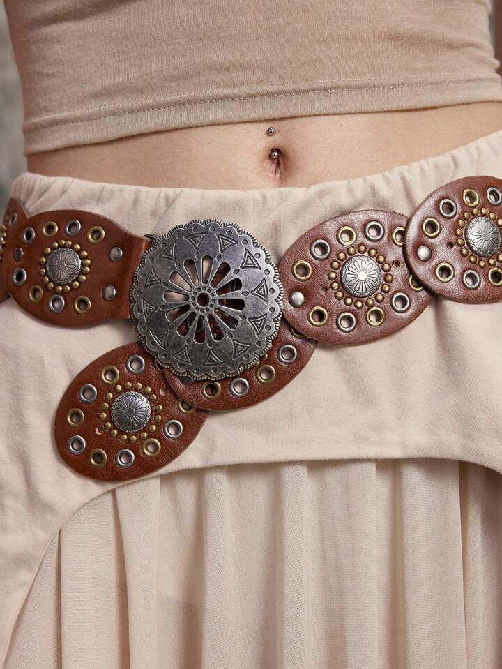 Hippie قطعة واحدة من الأحزمة الجلدية البوهيمية الغربية بإكسسوار معدني وزهرة مفرغة، مناسبة للفساتين والجينز والملابس اليومية العادية