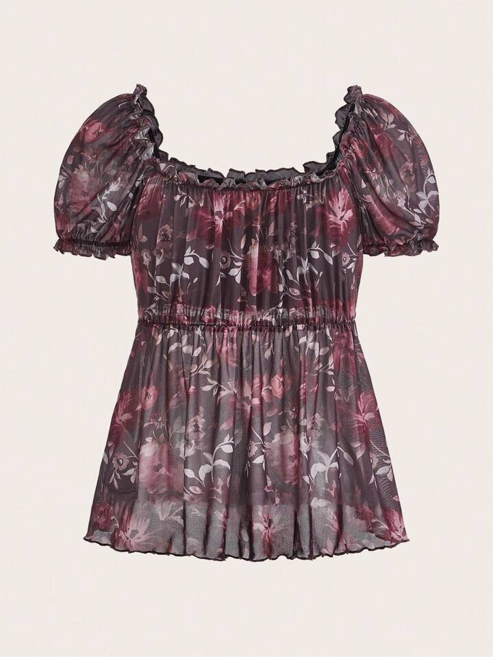 Hippie لباس علوي بطباعة زهر شامل مقلم بهدب شبكة