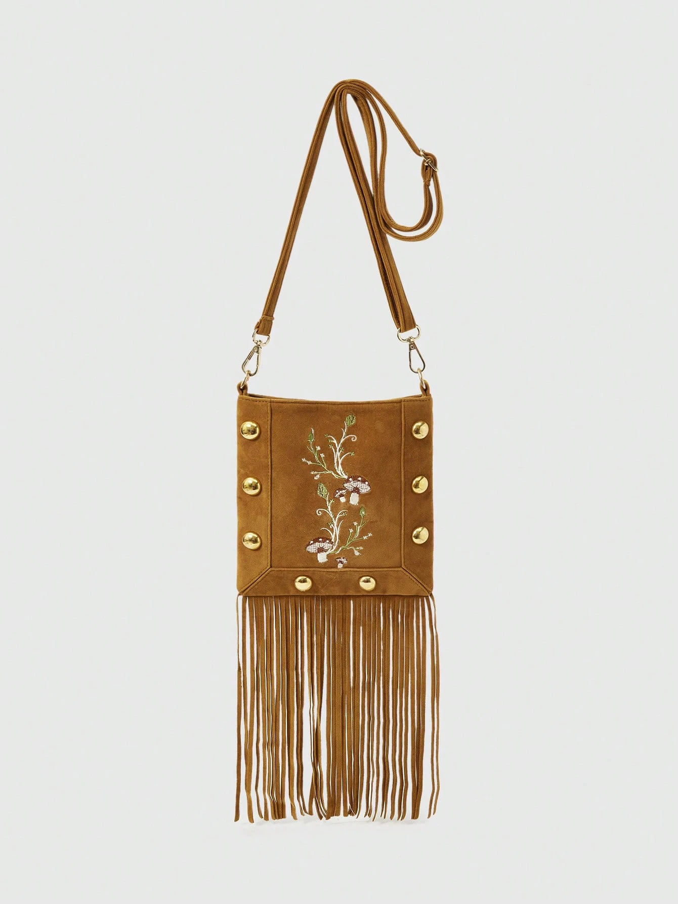 Hippie حقيبة كتف للنساء من الغزال البني مطرزة بالفطريات والكروم المعدني