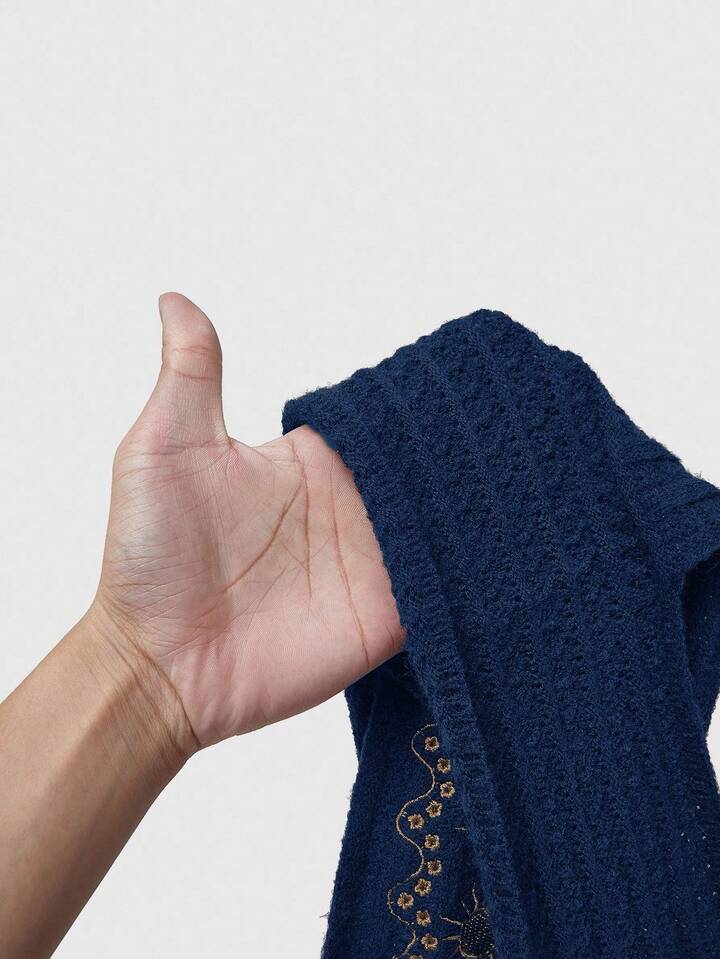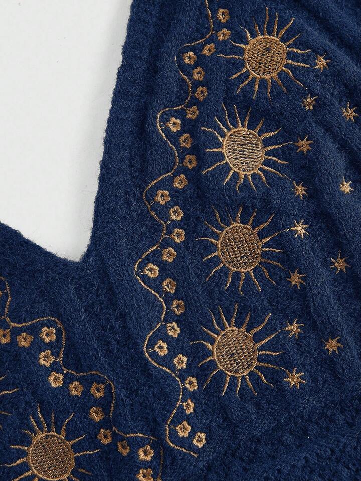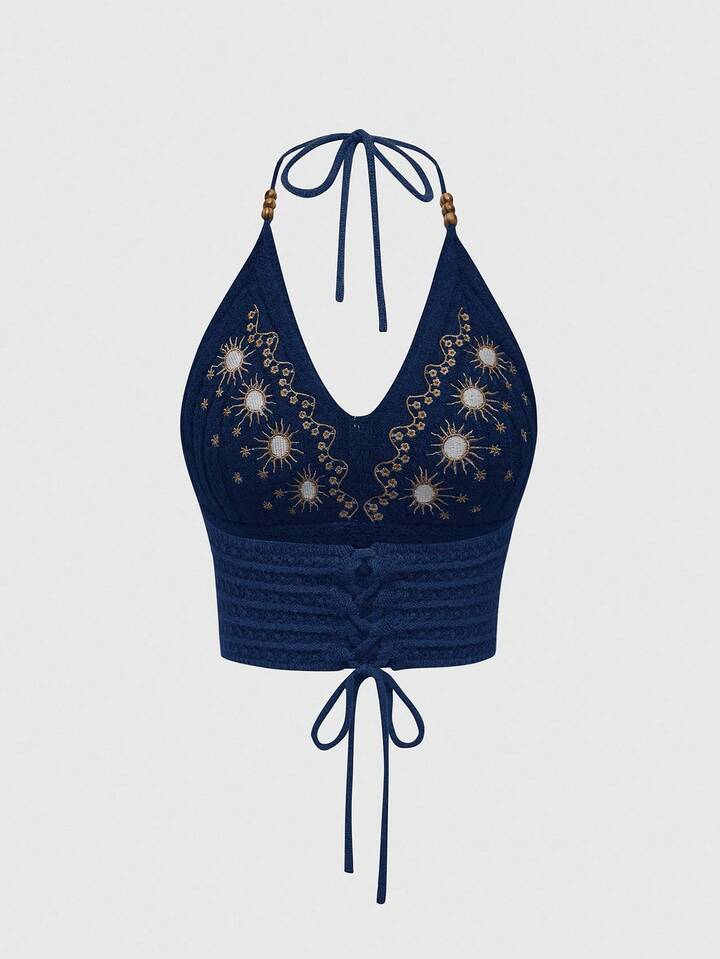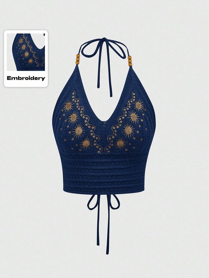 Hippie ملابس علوية مطرزة بتصميم متقاطع ظهر مكشوف وياقة حلقة للرقبة مصنوعة من الأقمشة المحبوكة