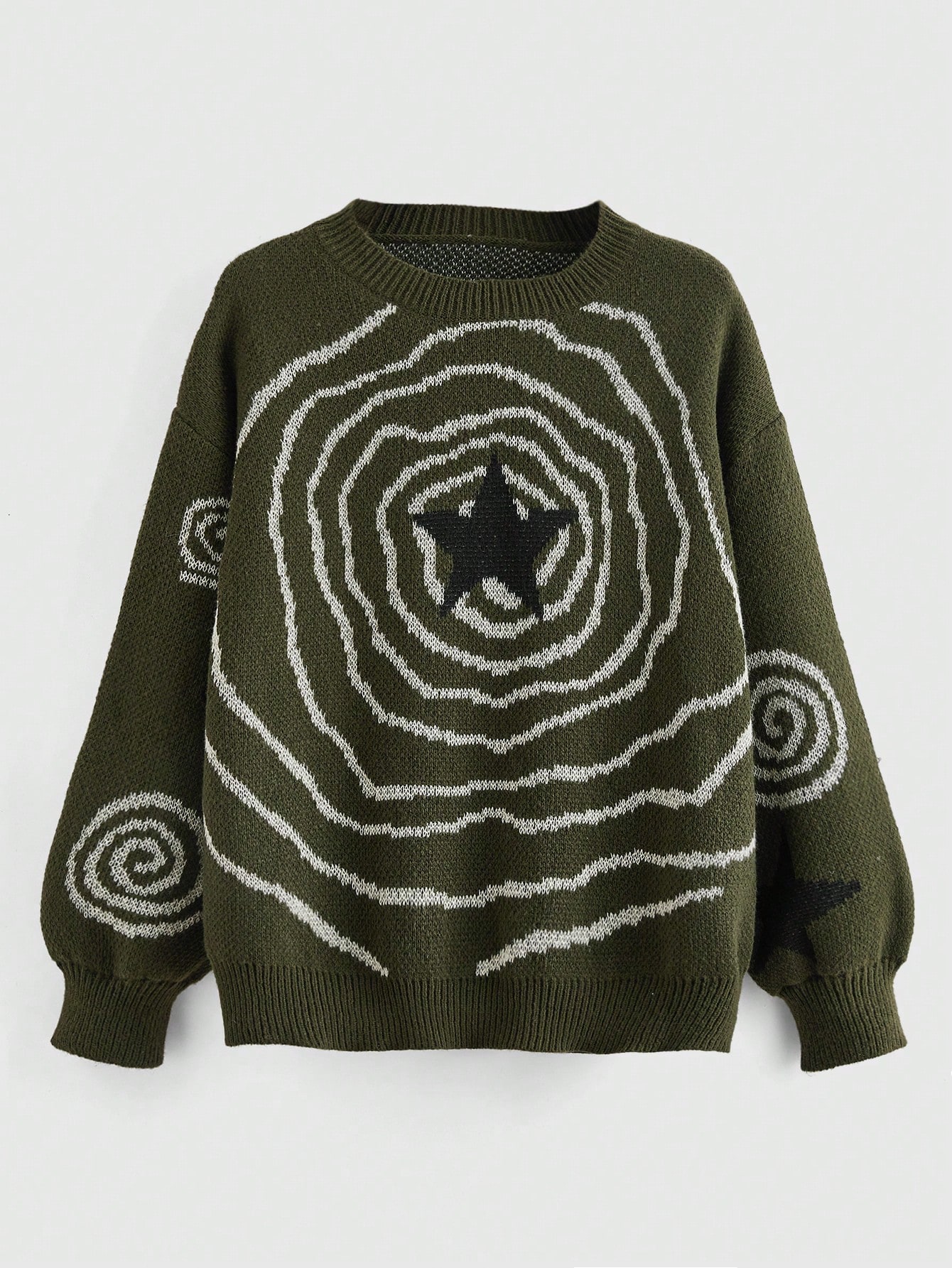 Hippie كنزة صوف نمط جرافيك منخفض الاكتاف