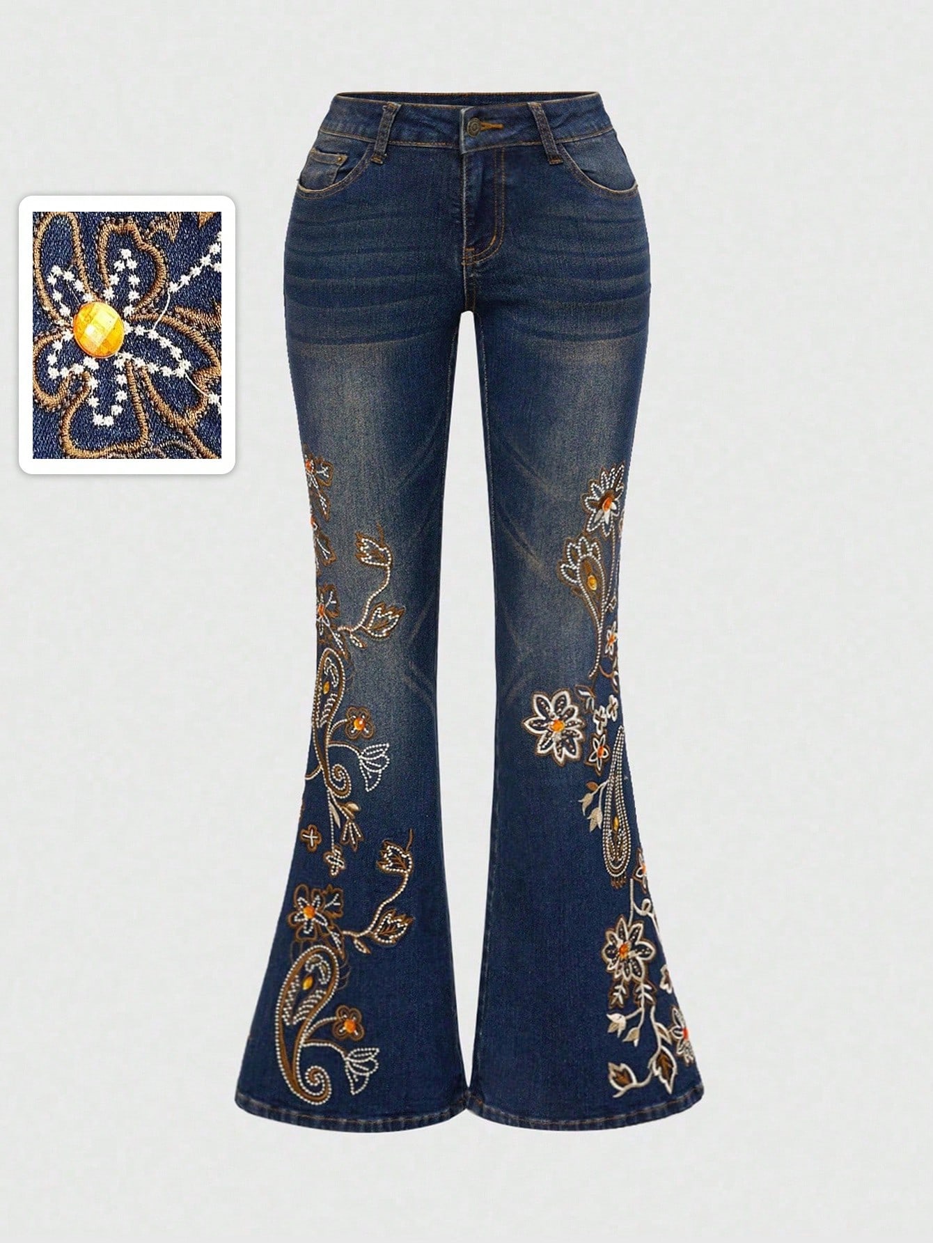 Hippie جينز نسائي ذو قصة واسعة مطرز بالزخارف الهندية والراين، ذو خصر منخفض جدًا وقصة ضيقة، بطراز فينتاج هيبي