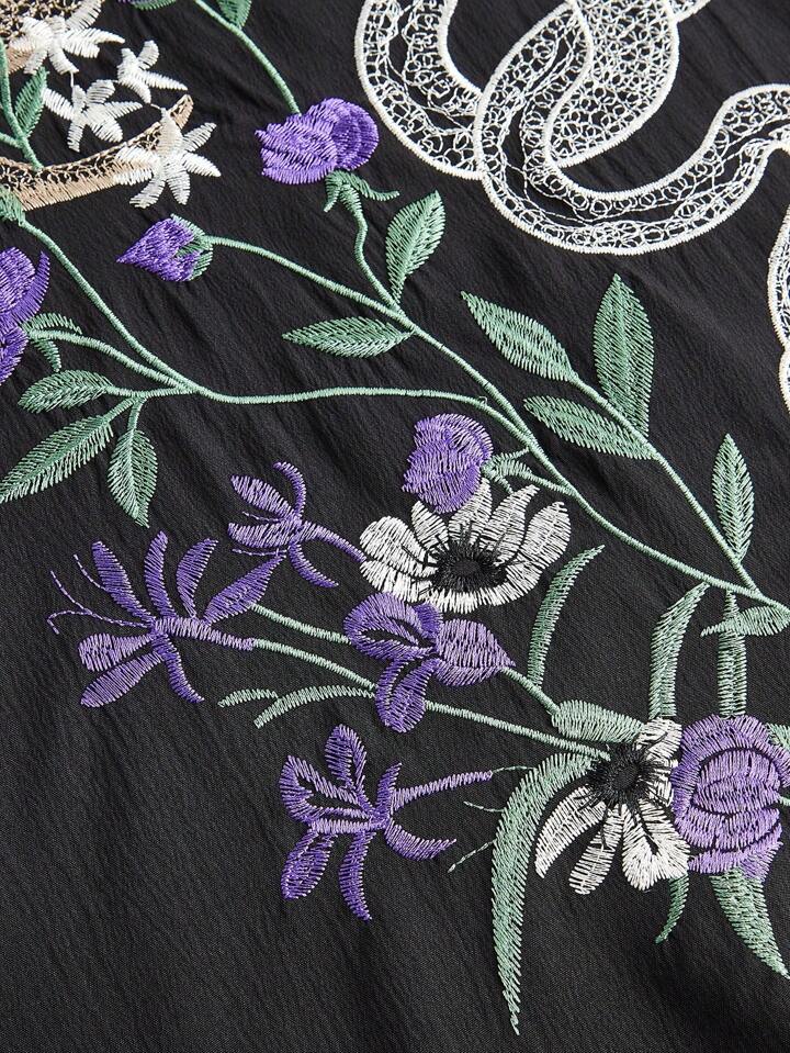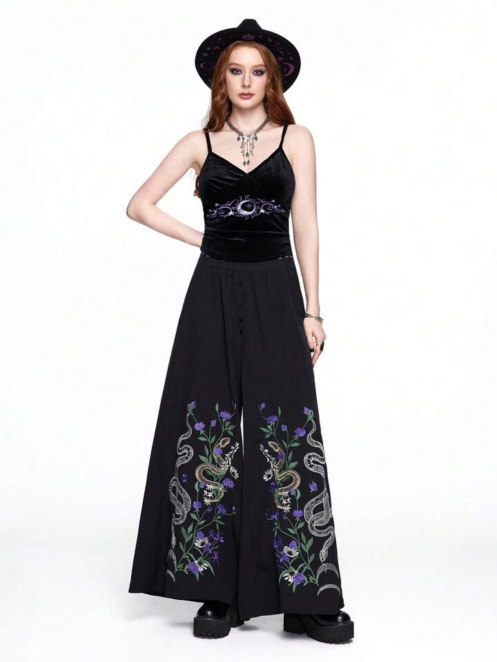 Hippie بنطلون نسائي فضفاض كاجوال بخصر عالي مطرز بزهور وأفعى، ذو ساق واسعة