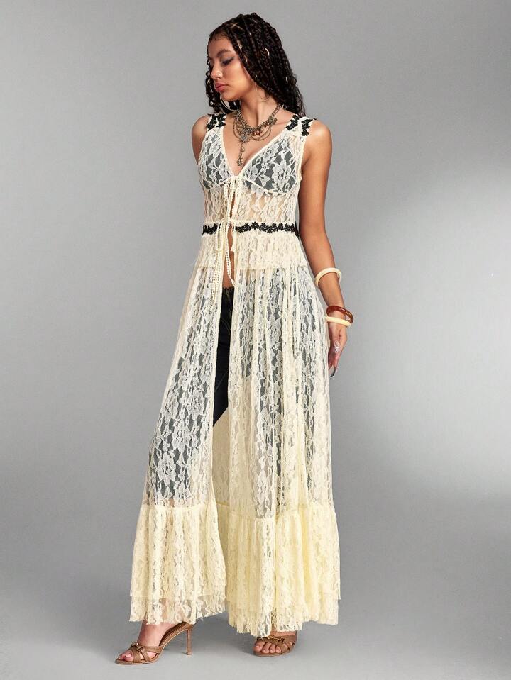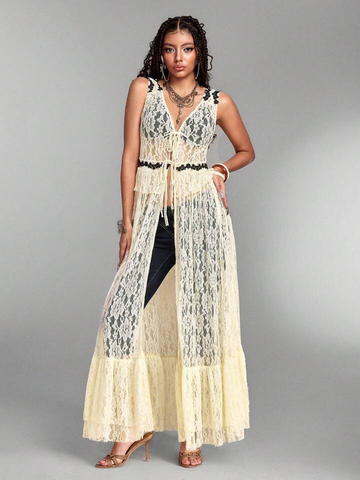 Hippie قميص نسائي بدون أكمام طويل مُزين بالتطريز وعُقدة أمامية