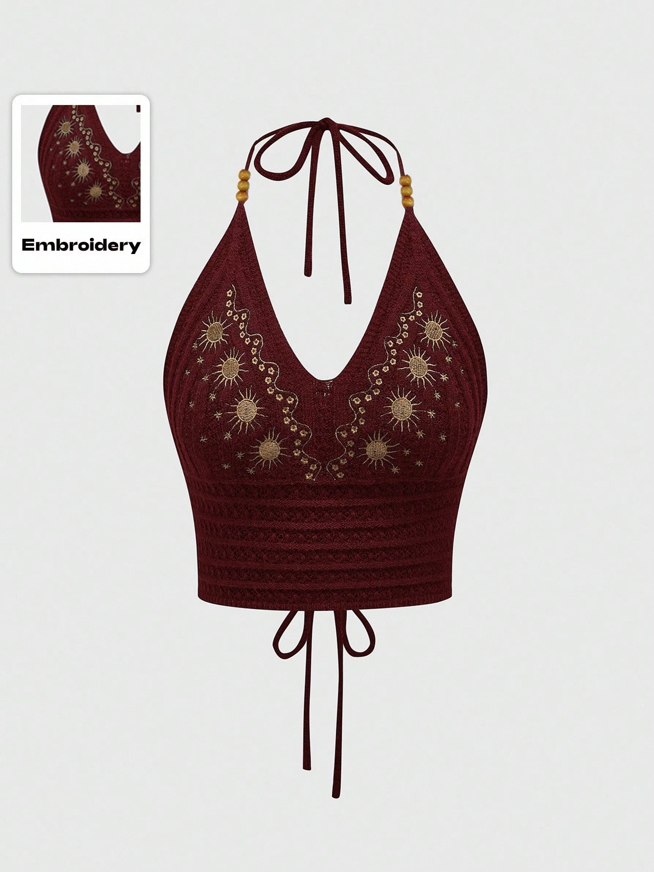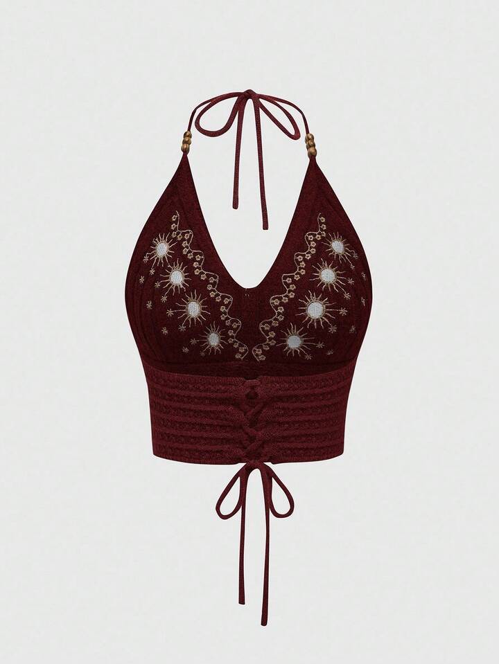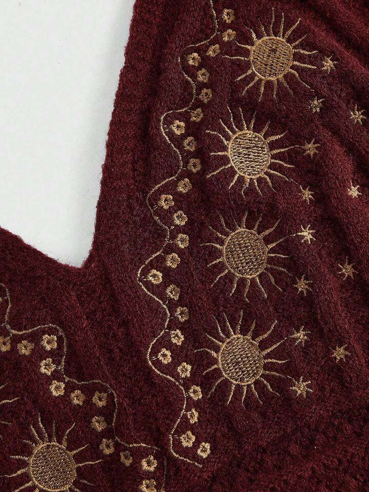Hippie ملابس علوية محبوكة بياقة حلقية مطوية مع تطريز شمس للنساء