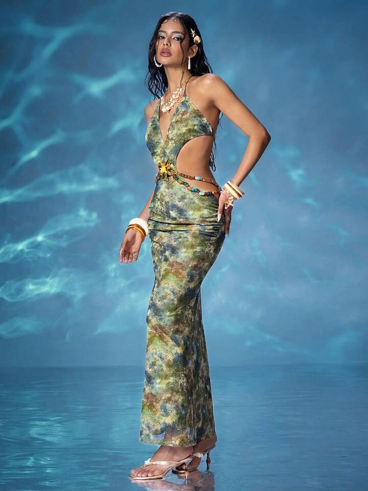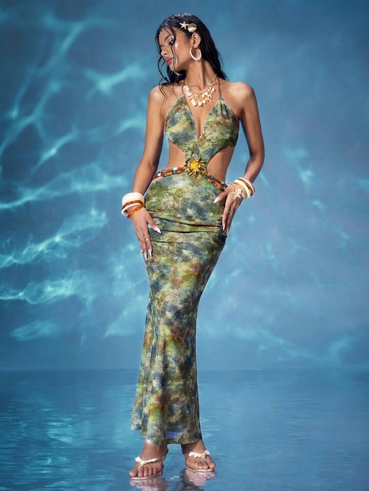 Hippie فستان ماكسي نسائي بنمط مريول الحورية بنسيج مزدوج الطبقات مناسب لأجازة الشاطئ