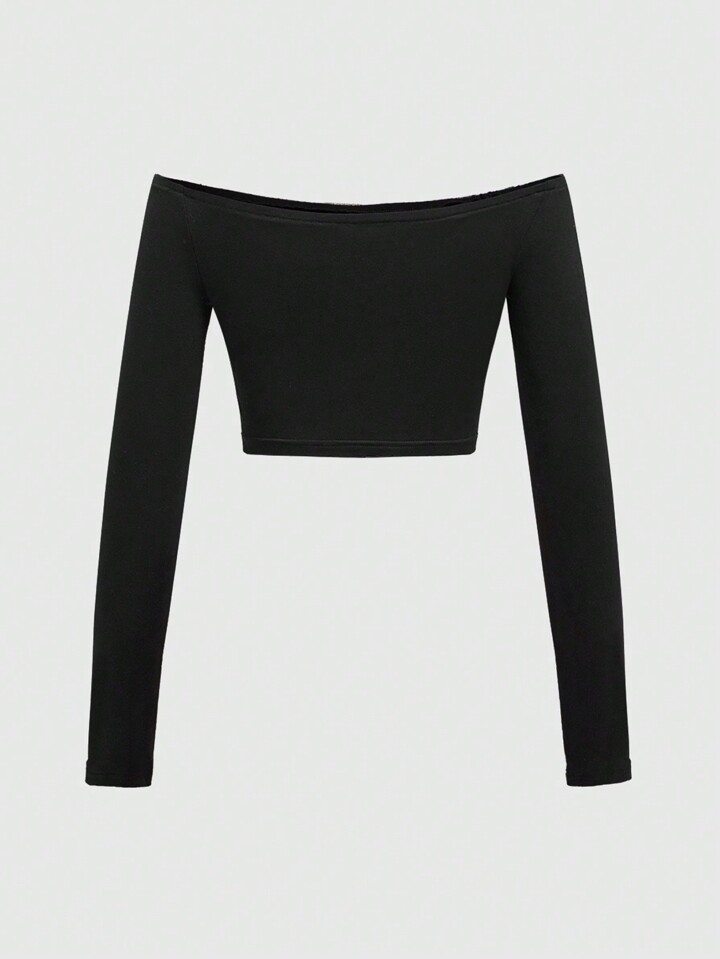 Hippie تي شيرت قصيرة ذات كتف مكشوف وأكمام طويلة لون أحادي مع تفاصيل ربطة، ربيع وصيف