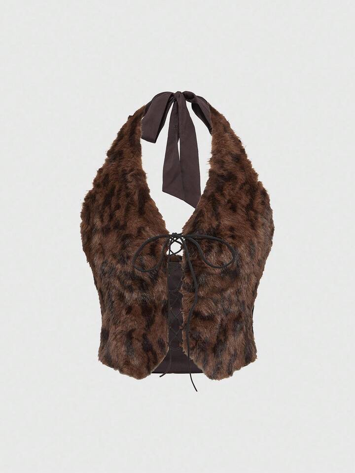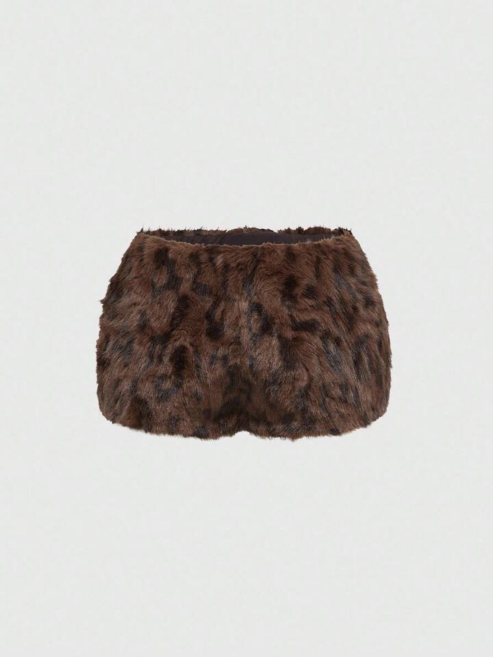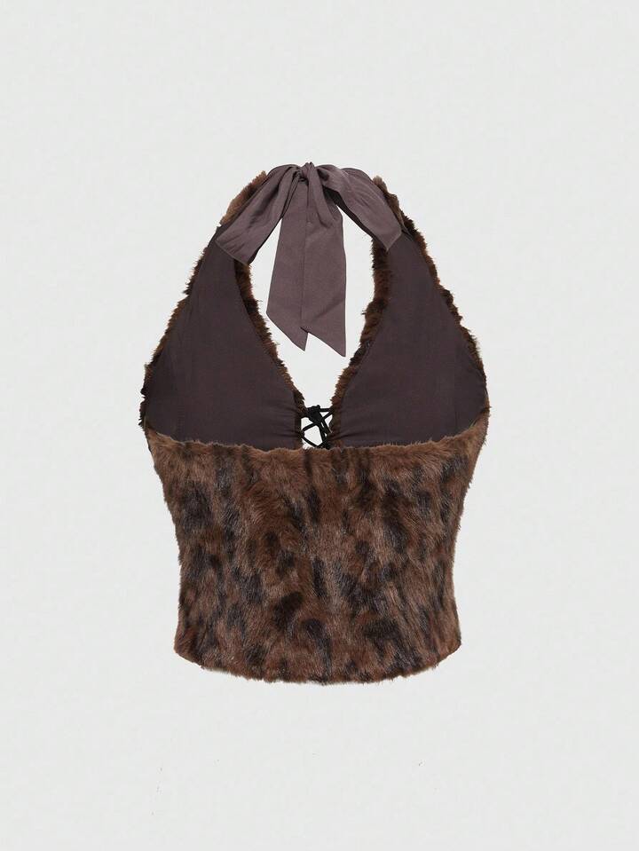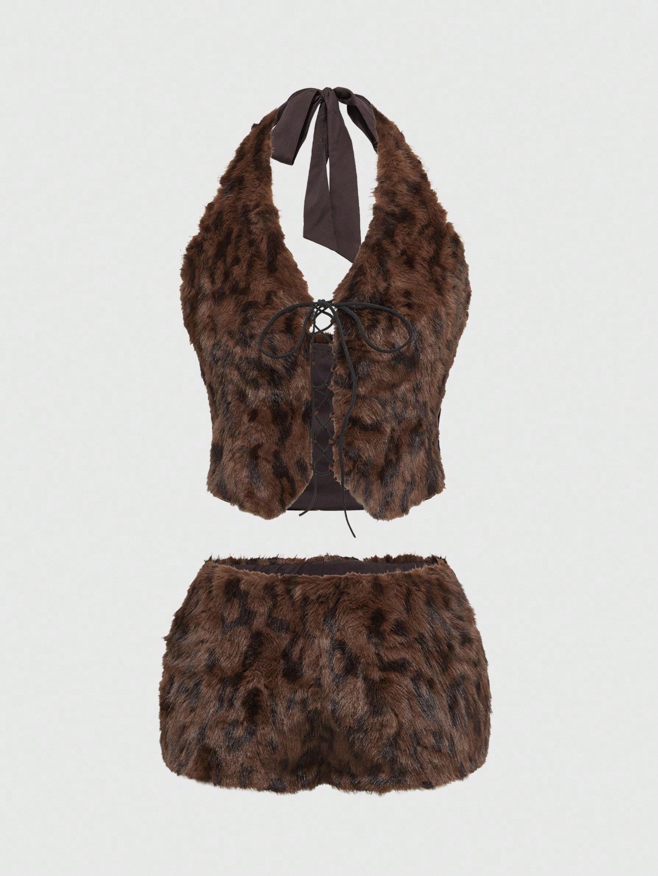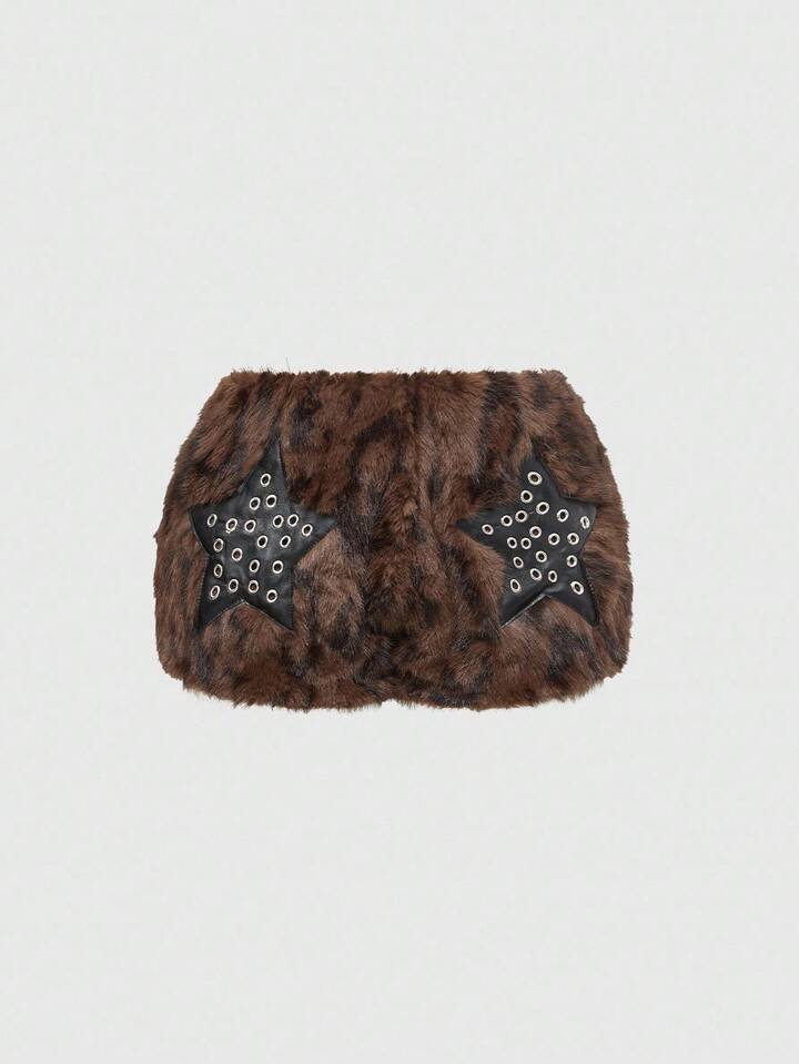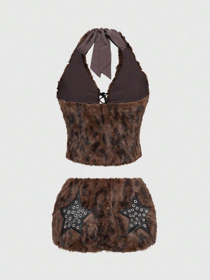 Hippie مجموعة قطعتين من ملابس علوية قصير من الفرو الصناعي بنمط النمر مع جيب نجمي، طراز Y2K هاراجوكو للنساء