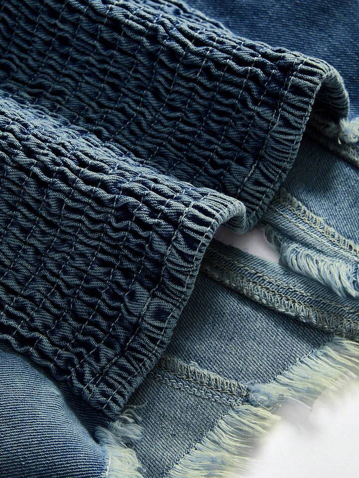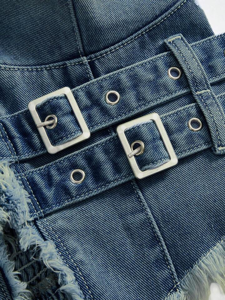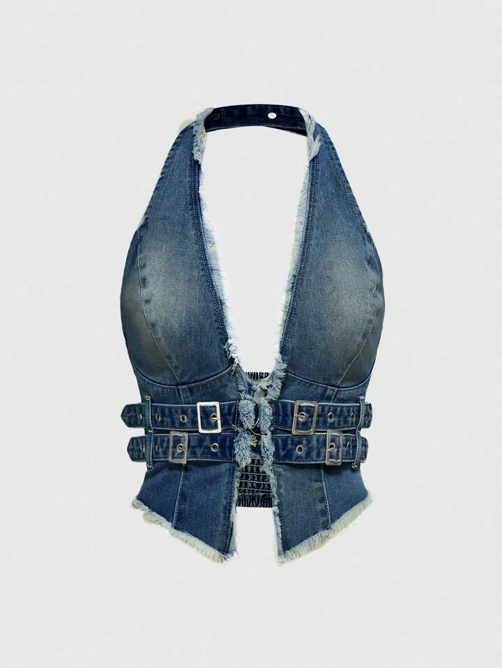 Hippie ملابس علوية جينز أنثوي بتصميم عميق الياقة V مزخرف بالرقع والتمزق، أزرار معشقة، قطعة جذابة من طراز Y2K