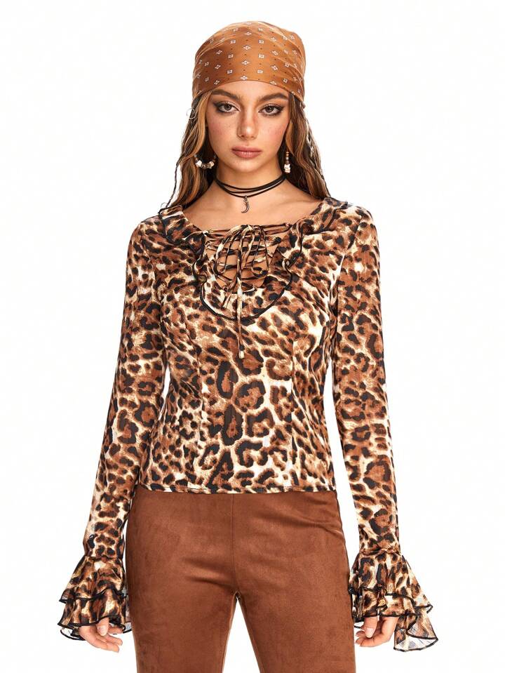 Hippie بلوزة شيفون شفافة للنساء بأكمام واسعة ذات رباط مطبوعة بنمط نمر من طراز Y2K