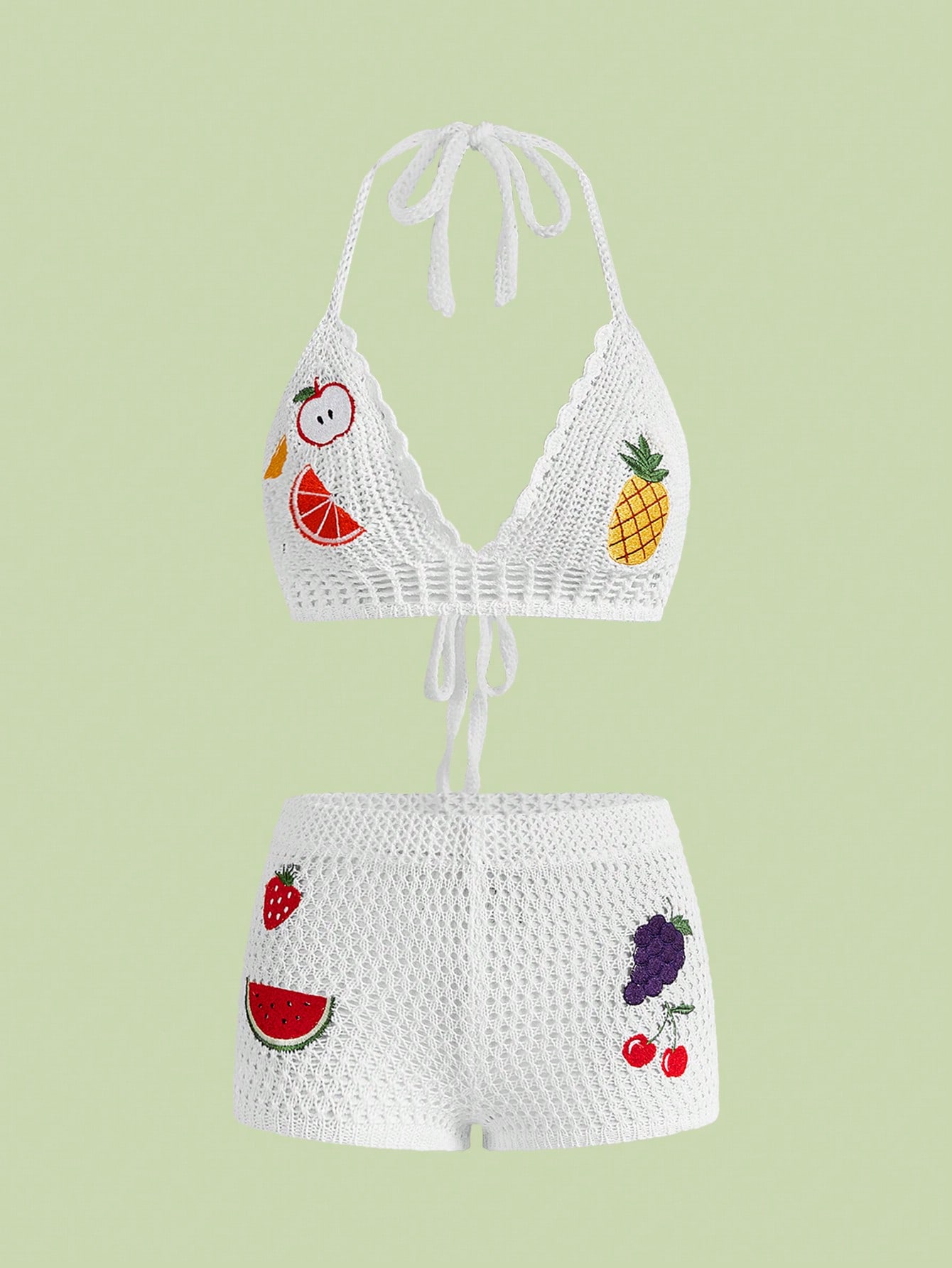بلوزة كامسول مطرزة بالفاكهة مع ربطة عنق وشورت قصير جدًا للنساء مجموعة قطعتين