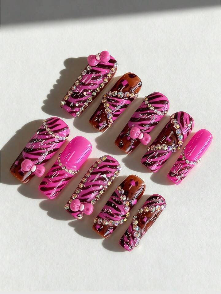 J-Fashion 10 قطعة أظافر مزيفة عالية الجودة بتصميم نمر وفهد وفيونكة، بطراز Y2K، بالإضافة إلى 3 قطع لاصق ثنائي الجانب، وديكور فيونكة قابل للإزالة ثلاثي الأبعاد، وملصقات أظافر مرصعة بالراين والبريق مناسبة للأعياد والحفلات والرقص والاستخدام اليومي