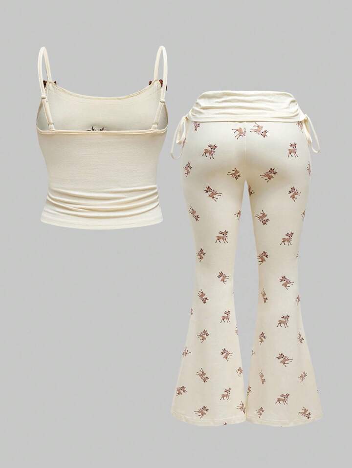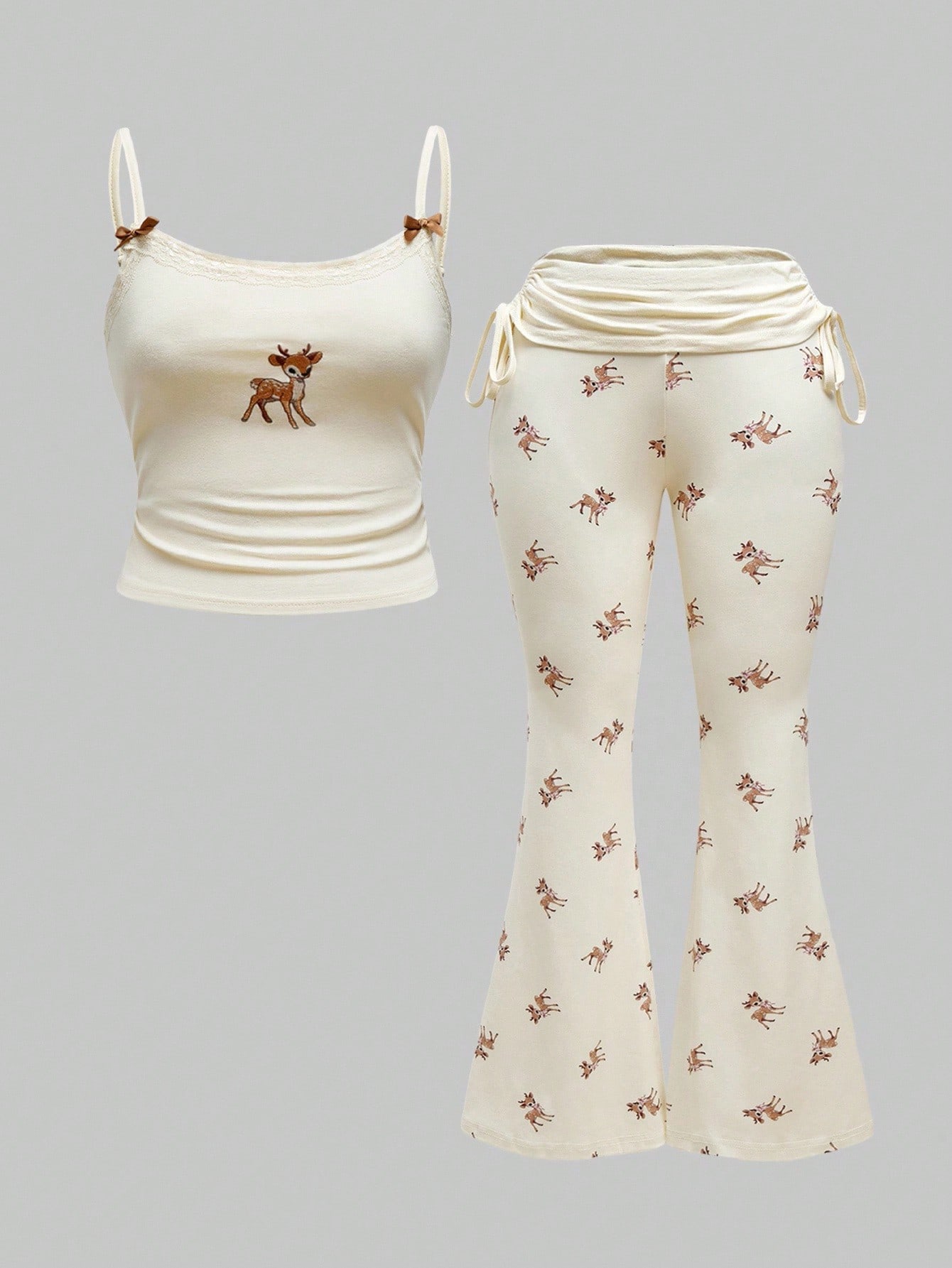 J-Fashion بلوزة مطرزة بالدانتيل بشكل غزال مقترنة مع بنطلون واسع مطبوع بنقشة الغزال