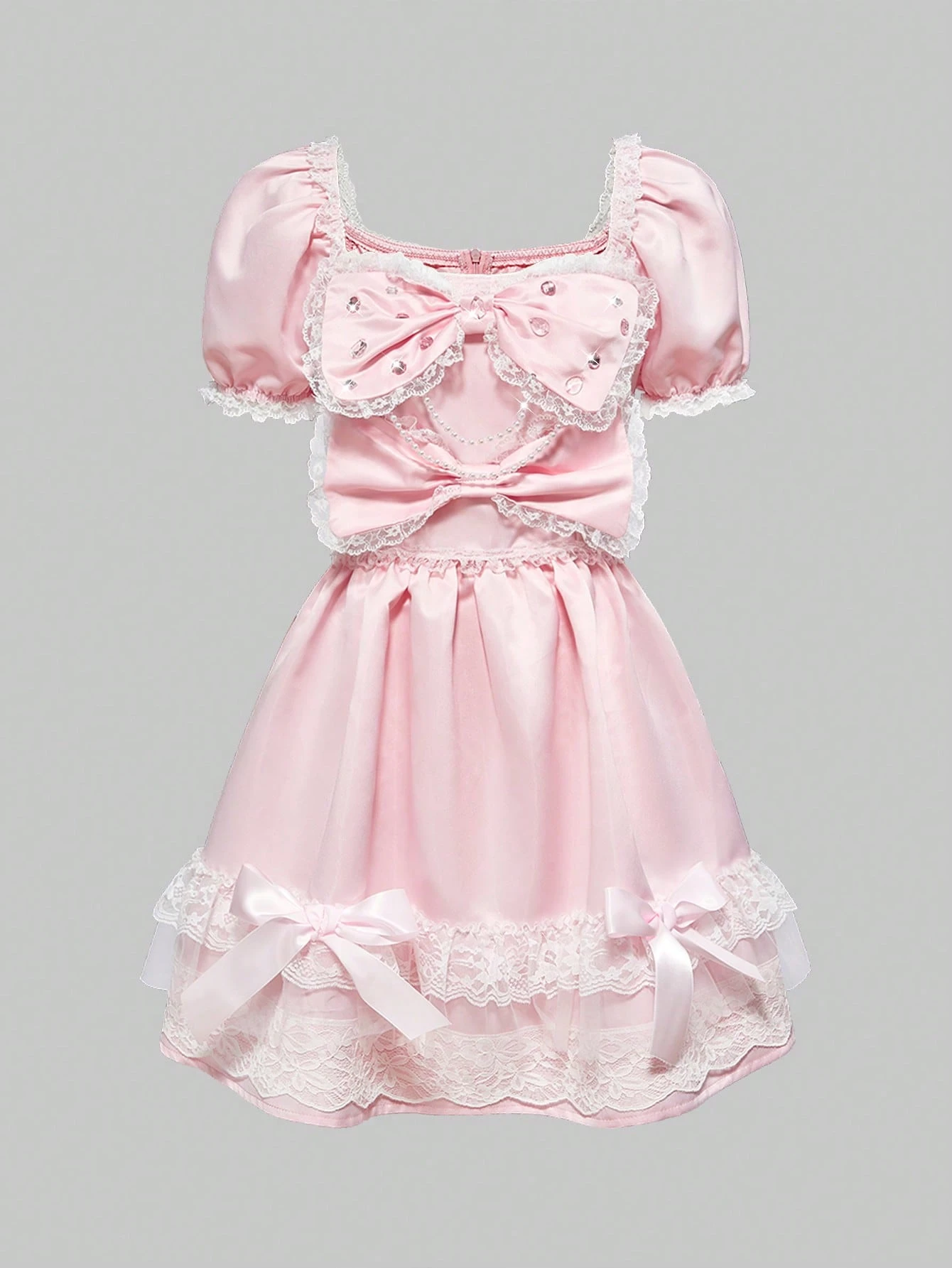 J-Fashion فستان قصير زهري للنساء ذو تصميم أميرة مع زخرفة فيونكة كبيرة بأسلوب فتاة شيبويا