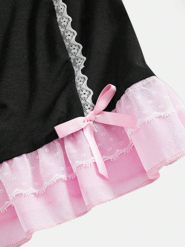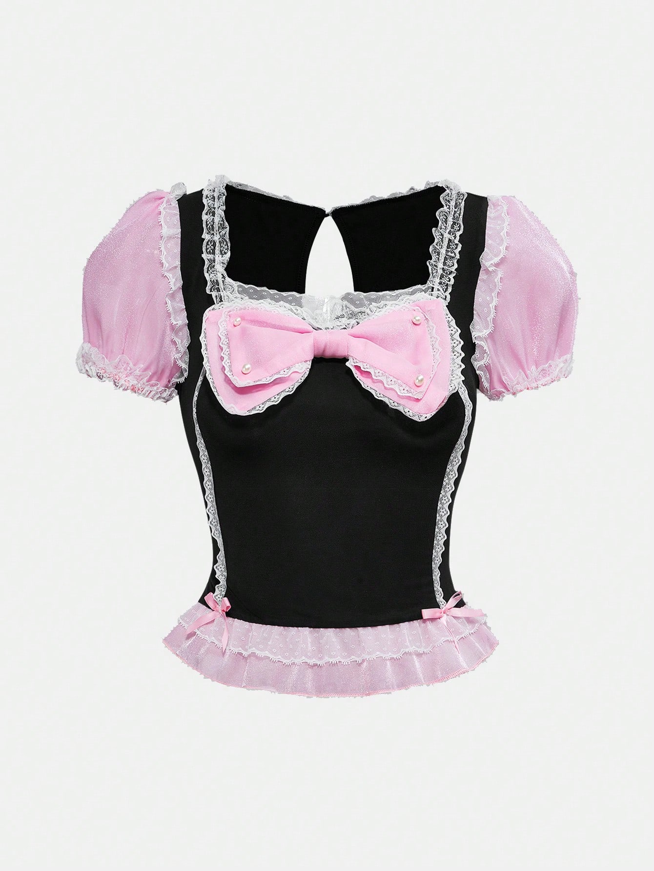 J-Fashion تي شيرت حريمي بخصر حلقة وتصميم من الدانتيل مجزأ بتأثير Shibuya Girl Y2K