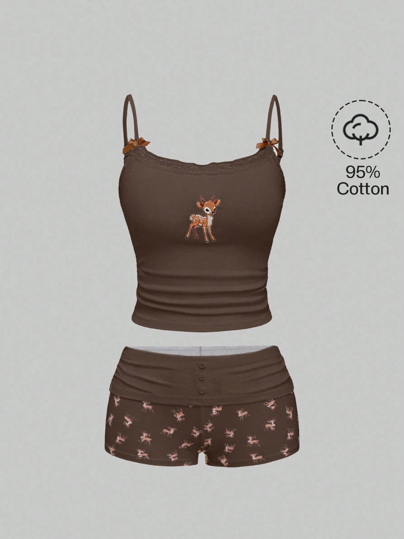 J-Fashion بدلة كاجوال نسائية مكونة من قمصان كامسول مطرزة براسم الغزلان والدانتيل مع شورت