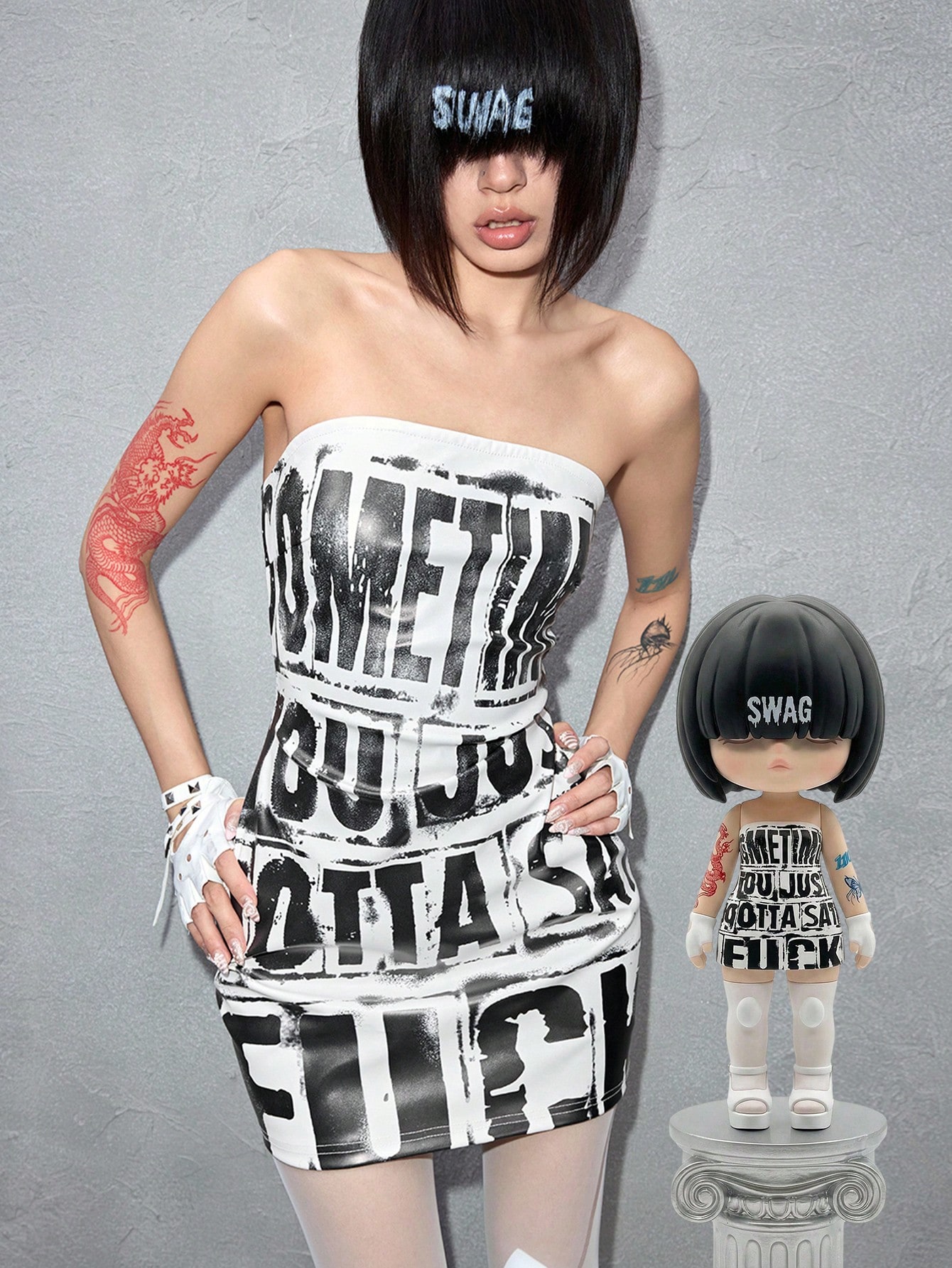 J-Fashion فستان ميني محكم مطبوع بشعار وعبارة الشارع من جلد البولي يوريثان بطراز دراجة نارية للنساء