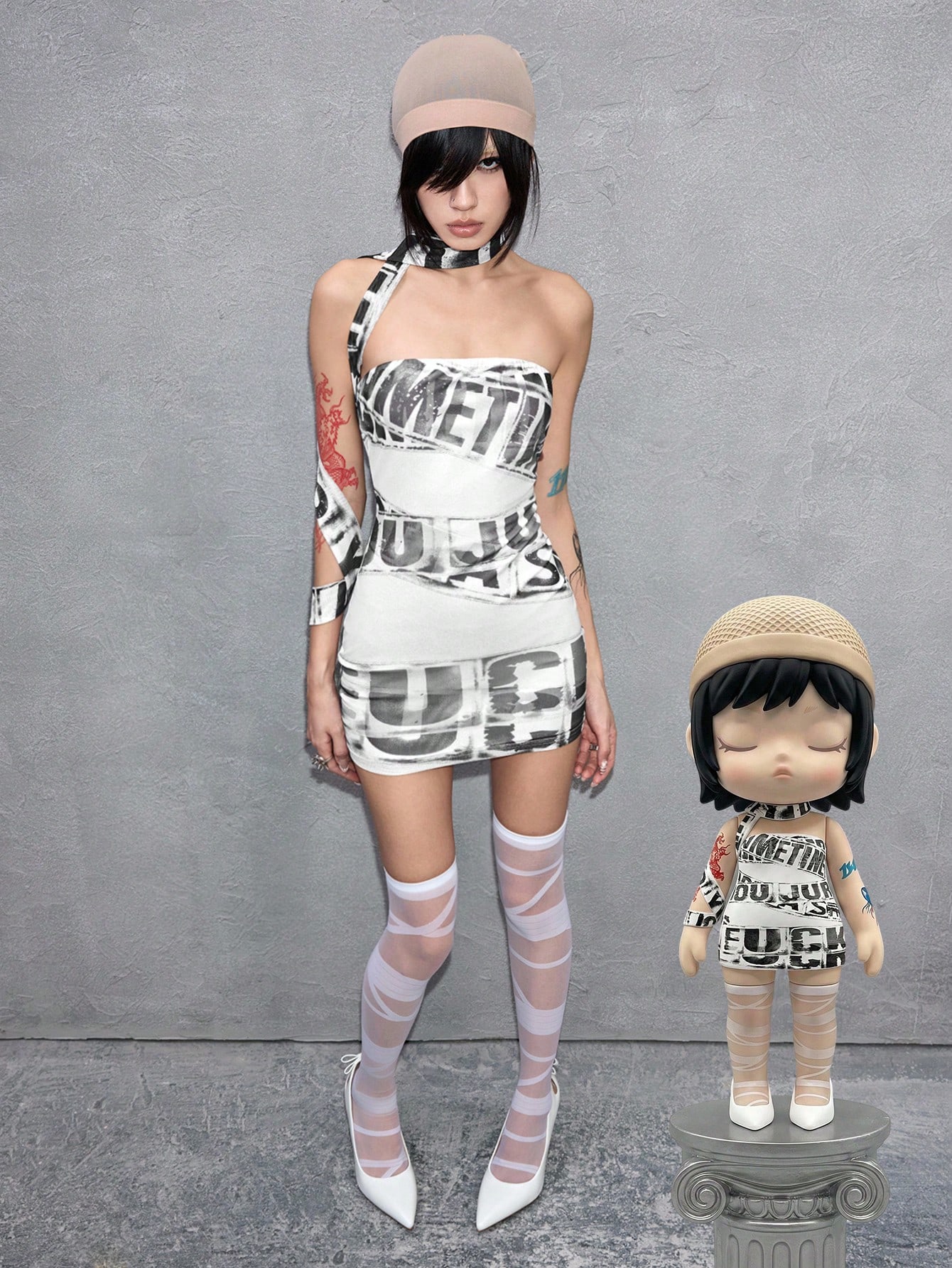 J-Fashion فستان بانديو شفاف قصير مع شعار أفانت-غارد Y3K جريء للنساء