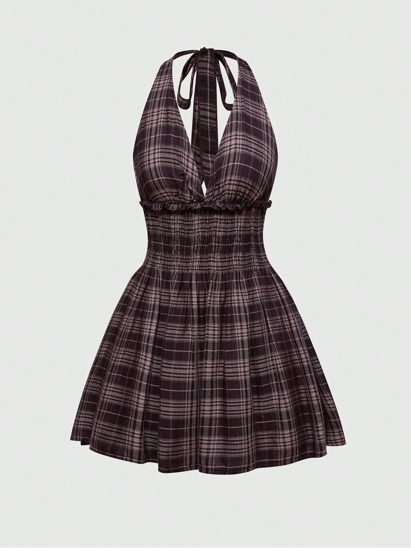 J-Fashion فستان قصير مطبوع بالمربعات الصيفية، مرتبط الخصر، ظهر عاري