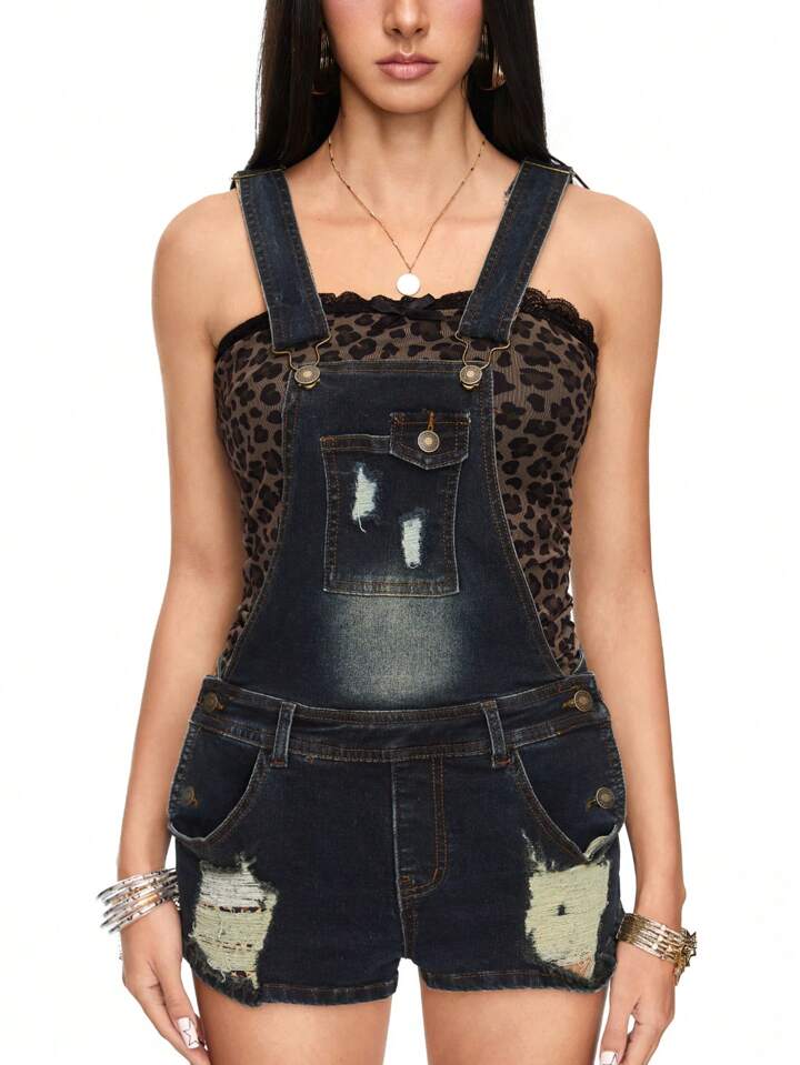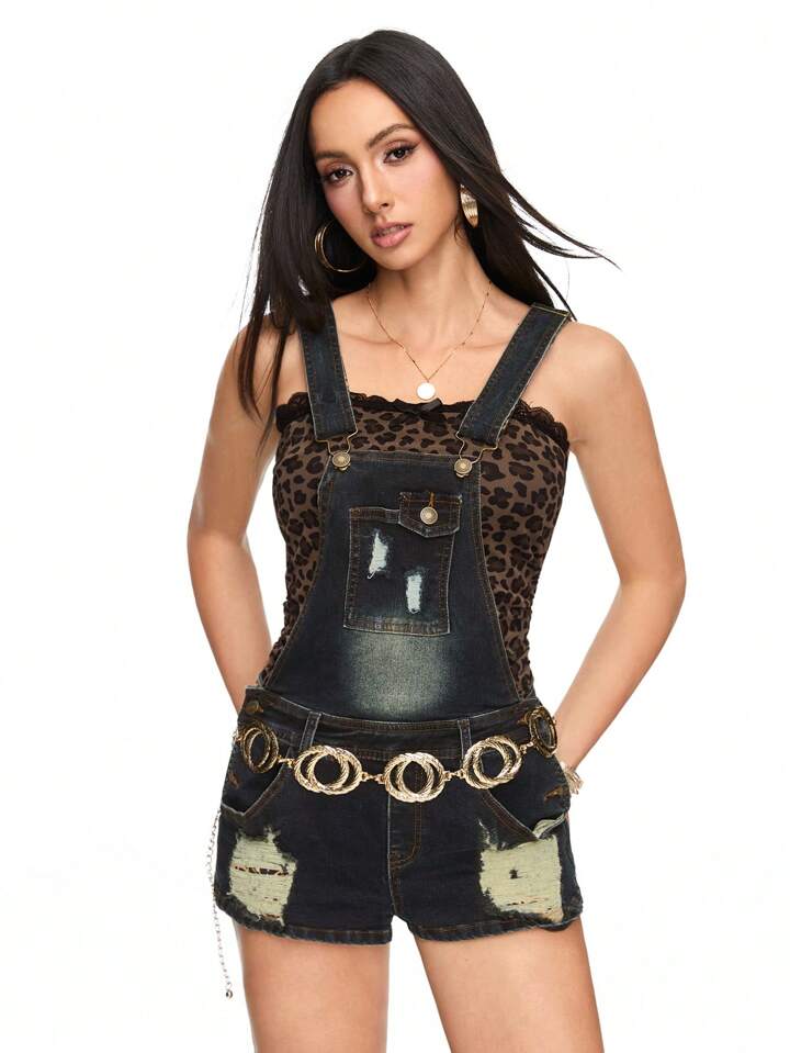 J-Fashion أوفرول و بدلة جينز ريترو عالية المستوى بطبعة فهد و حمالات كتف مزينة بأزرار و جيوب و حلقات للحزام للنساء