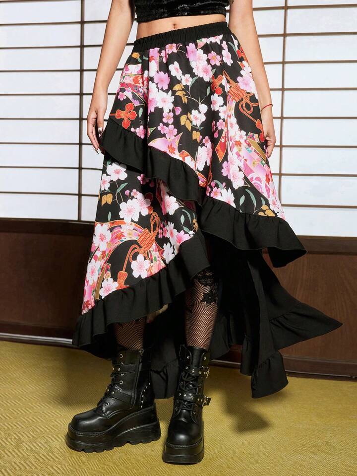 J-Fashion تنورة قصيرة أنيقة بتصميم خط A ، بطبعة زهور يابانية ، بتفاصيل كشكشة وذيل متناظر غير متماثل