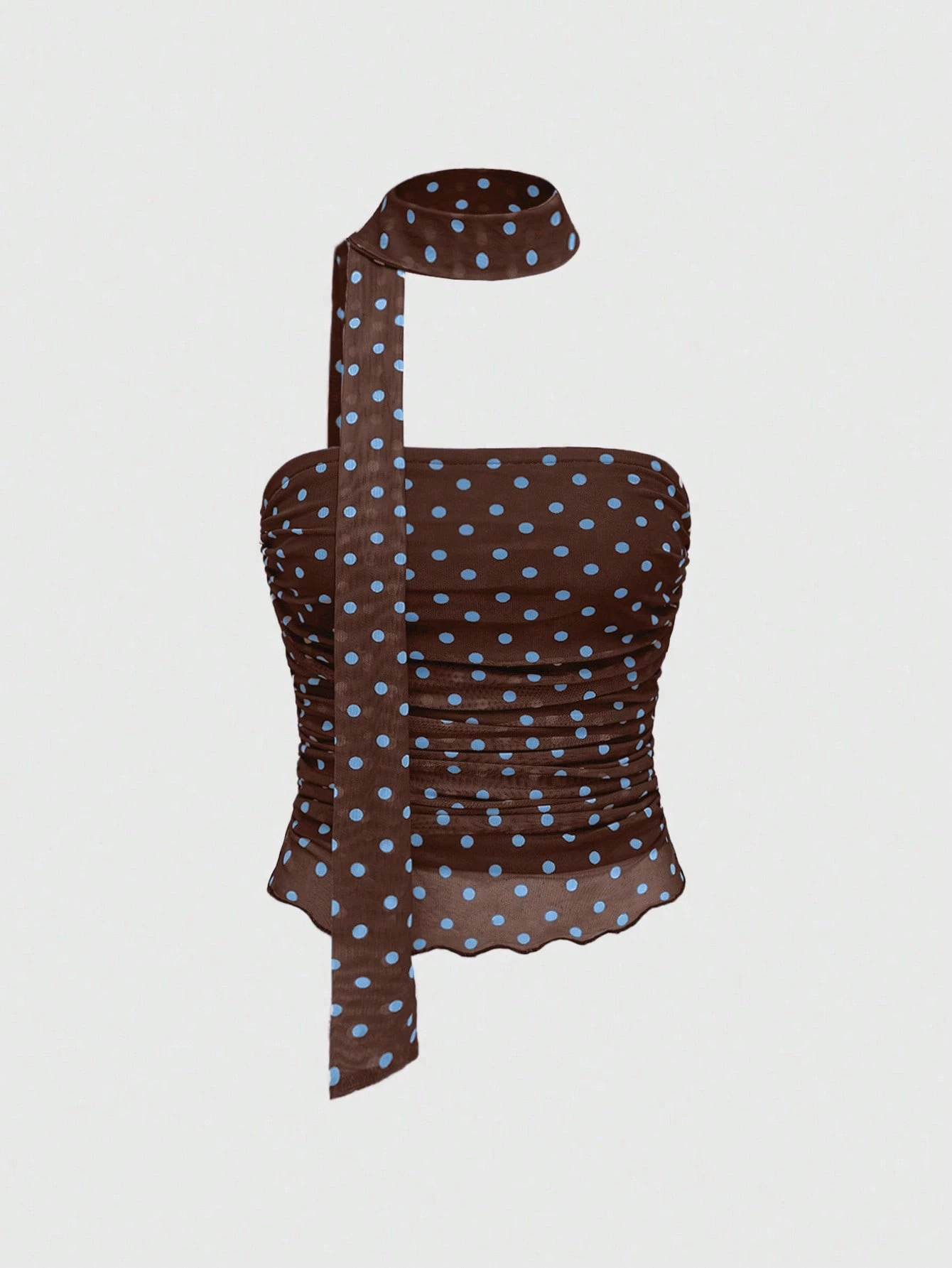 J-Fashion توب كامي رقبة حلقة مطرز بنقاط وشبك بطراز Y2K للنساء