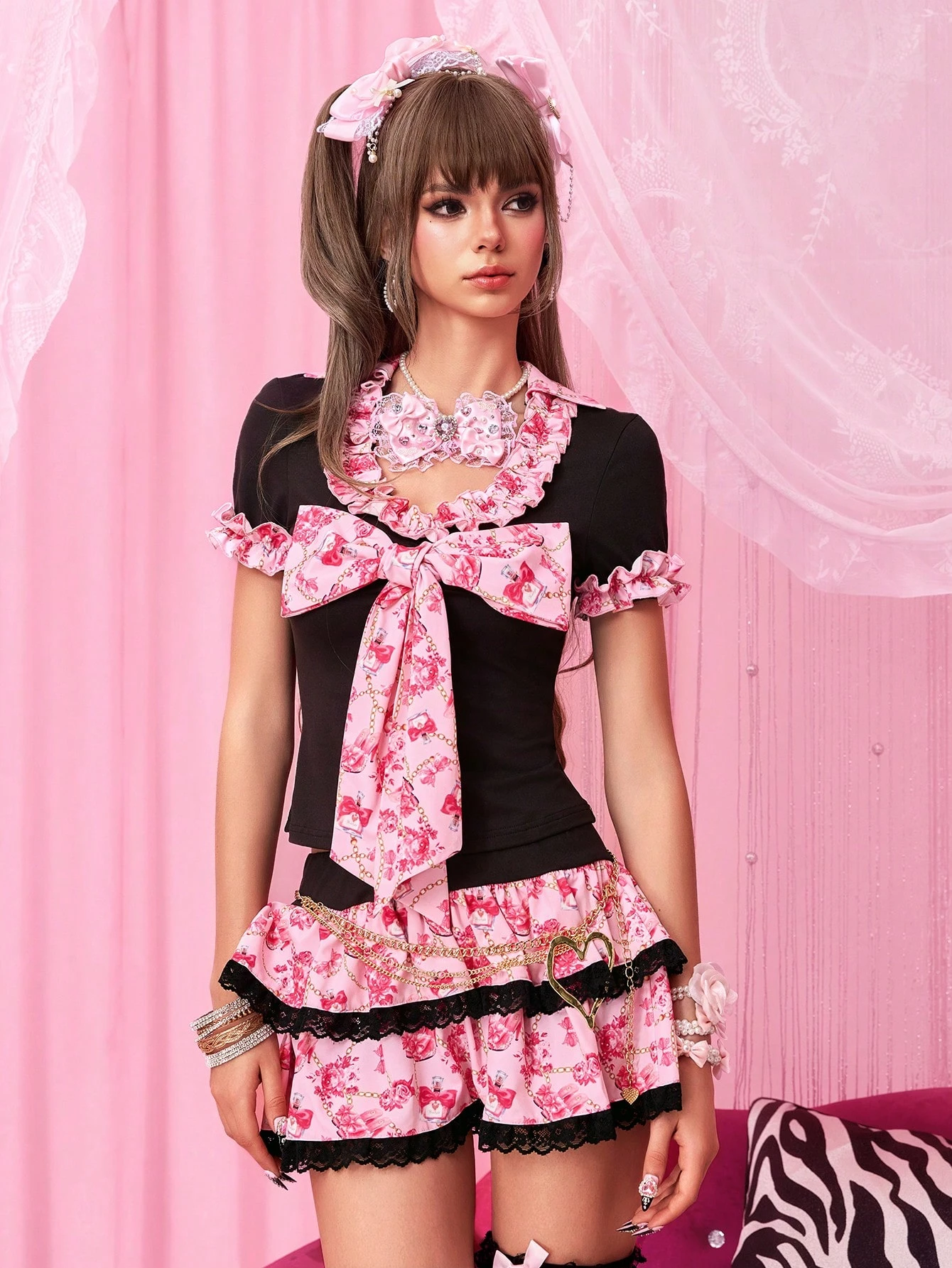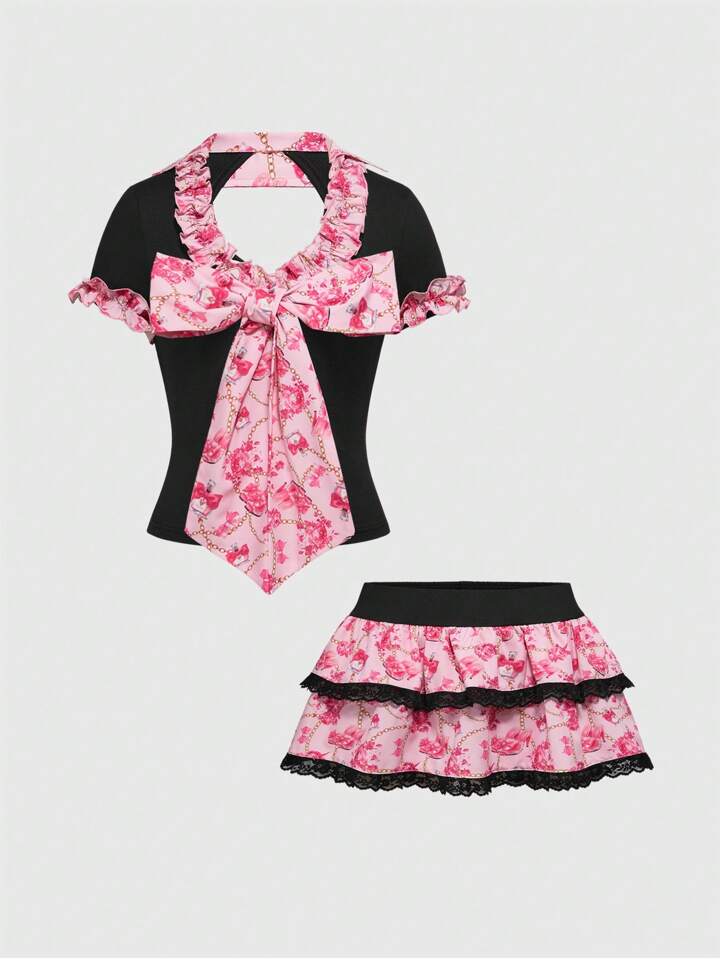 J-Fashion مجموعة قطعتين ملابس علوية أكبر مقاس بفيونكة ظهر مكشوف وتنورة مع ربطة من الدانتيل من طراز Himekaji Harajuku في طراز Y2K