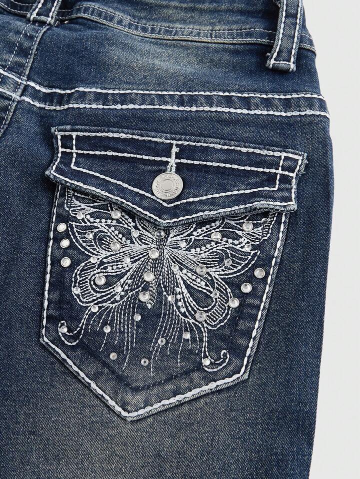 J-Fashion جينز جينز منمق بالزركشون والفراشة المطرز ذو الخصر المنخفض العصري، المدرسة