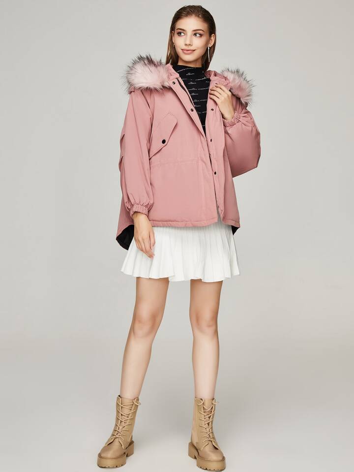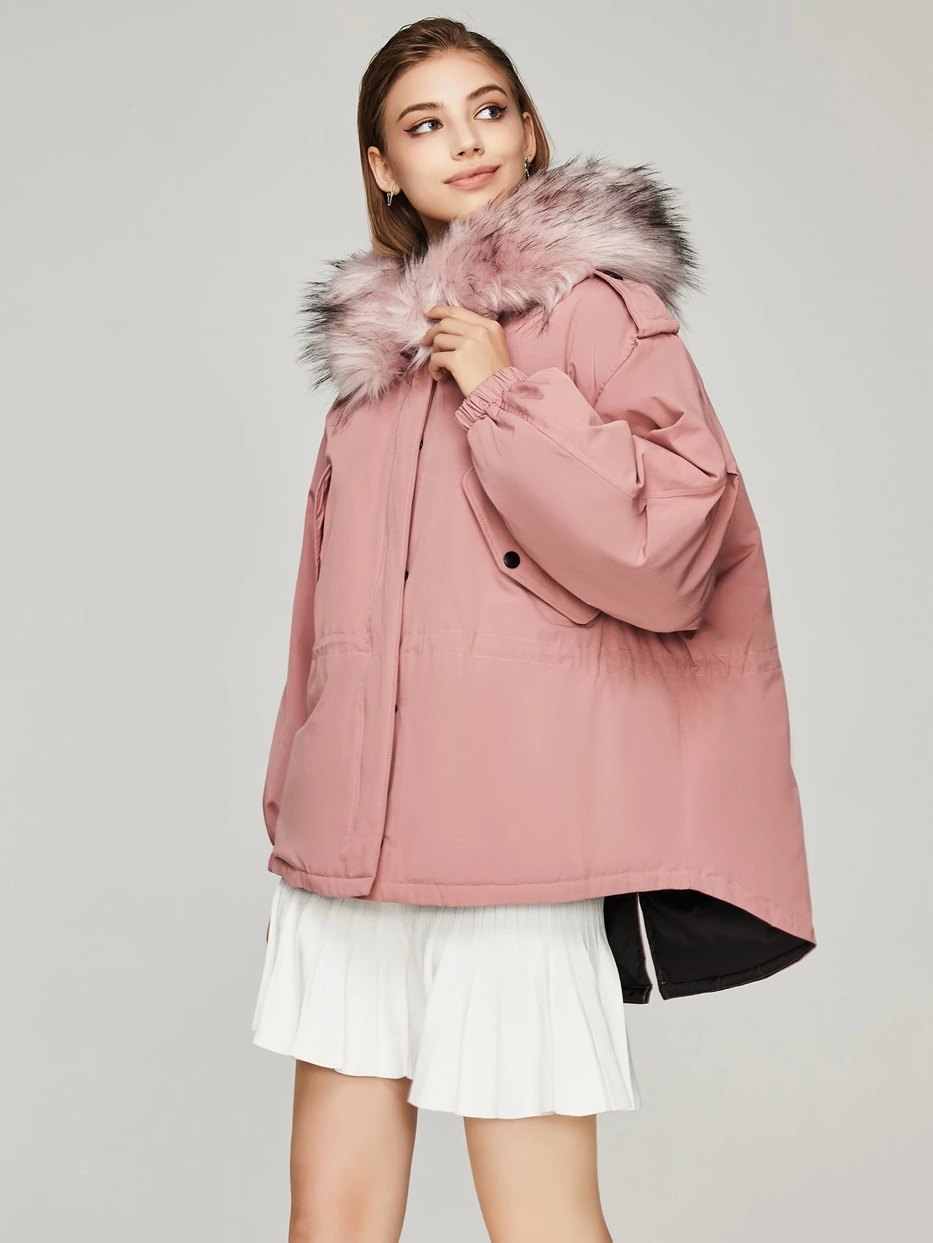 JAZZEVAR معطف داون مقنع بستة بفرو صناعي متباين