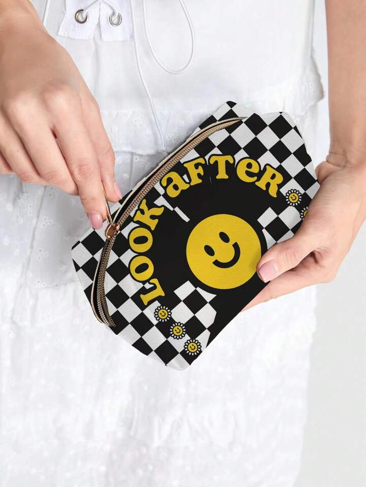 JORD.DESIGNS حقيبة مكياج ذات سعة كبيرة عصرية مزينة بنمط لفافة المربعات وجه مبتسم مع بطانة داخلية مقاومة للماء 132519