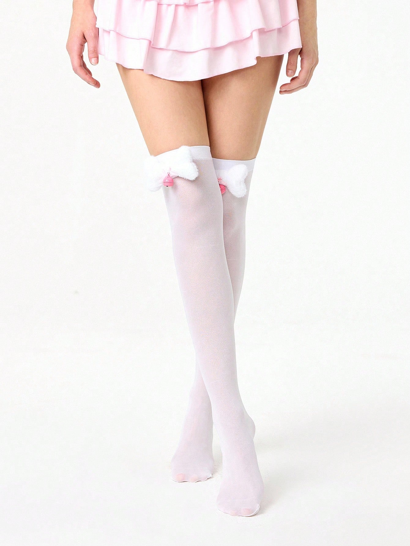 Kawaii زوج جوارب فوق الركبة ذات عظام فرو جميلة، جوارب طويلة مزينة بفيونكة وجرس، جوارب شفافة رفيعة مرنة للارتداء اليومي