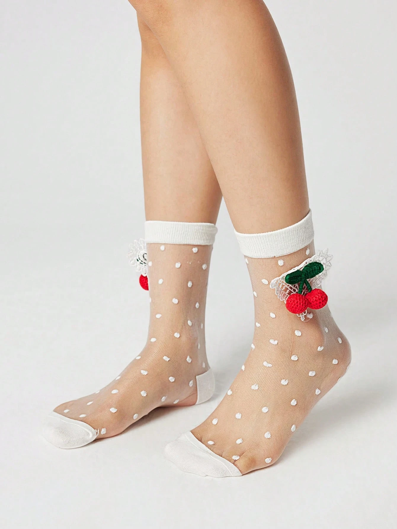 Kawaii زوج جوارب منتصف الساق للنساء للجميع المواسم ذات نقشة قلب أبيض وكرز ونقاط على خلفية بيضاء