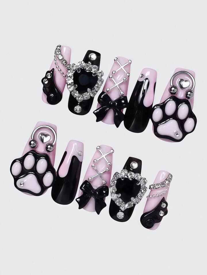 Kawaii 10 قطعة من الأظافر الصناعية المزخرفة بتصاميم جميلة مثل كف القطة، القلب الرومانسي، فيونكة الباليه، الجناح الأبيض، الصليب المعدني، وشريط وردي، مناسبة للارتداء اليومي والمناسبات الأخرى