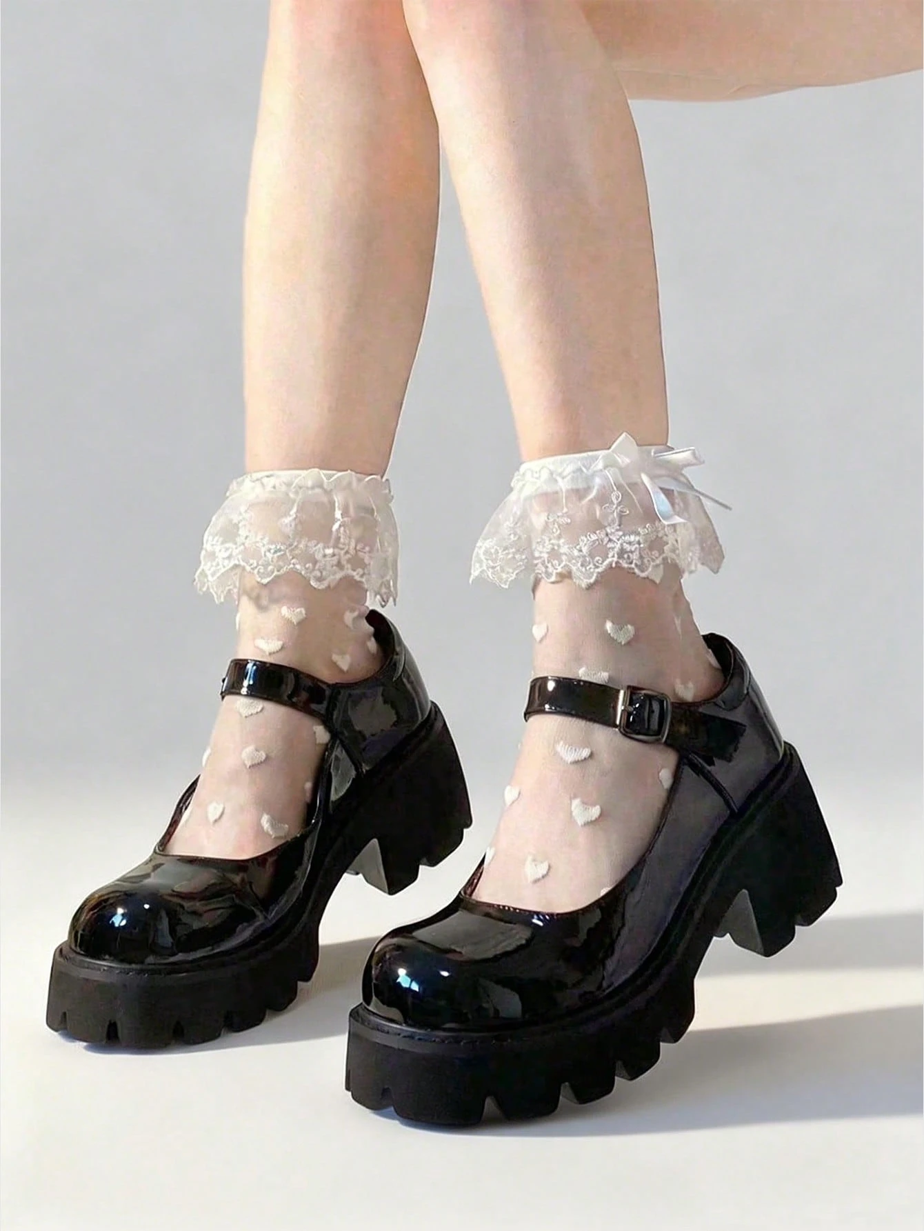 Kawaii زوج جوارب منتصف الساق بطراز لولوتا مع نمط قلب أبيض للنساء الجميلات في الصيف