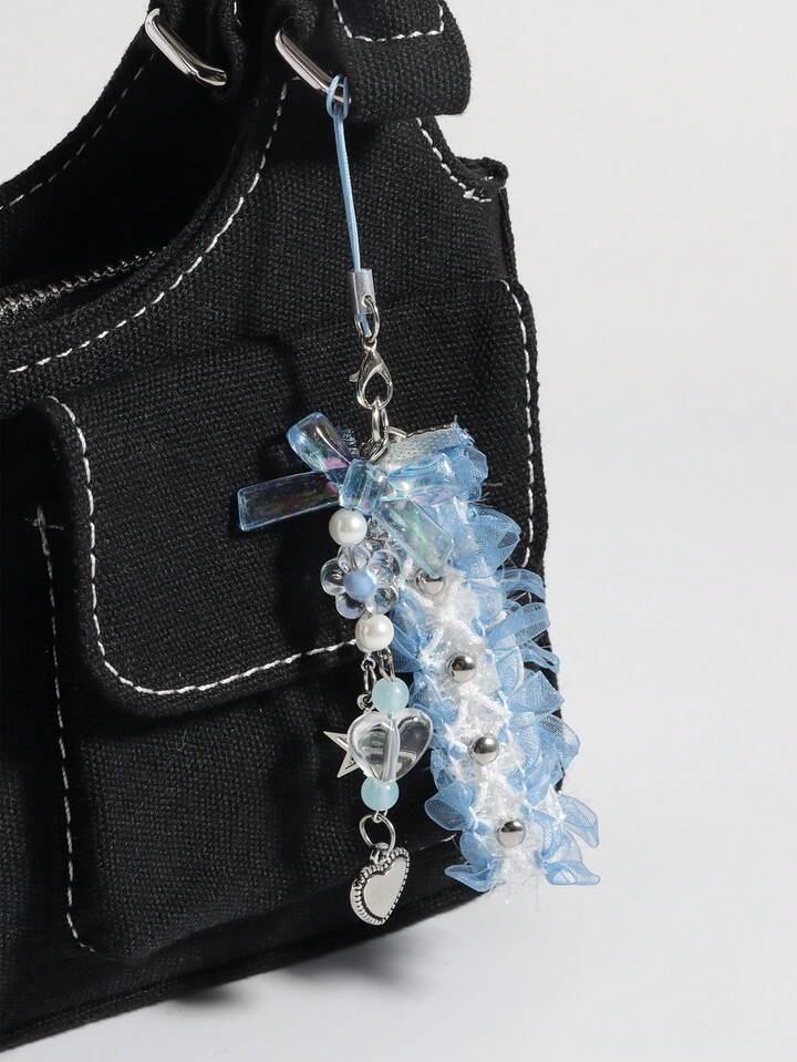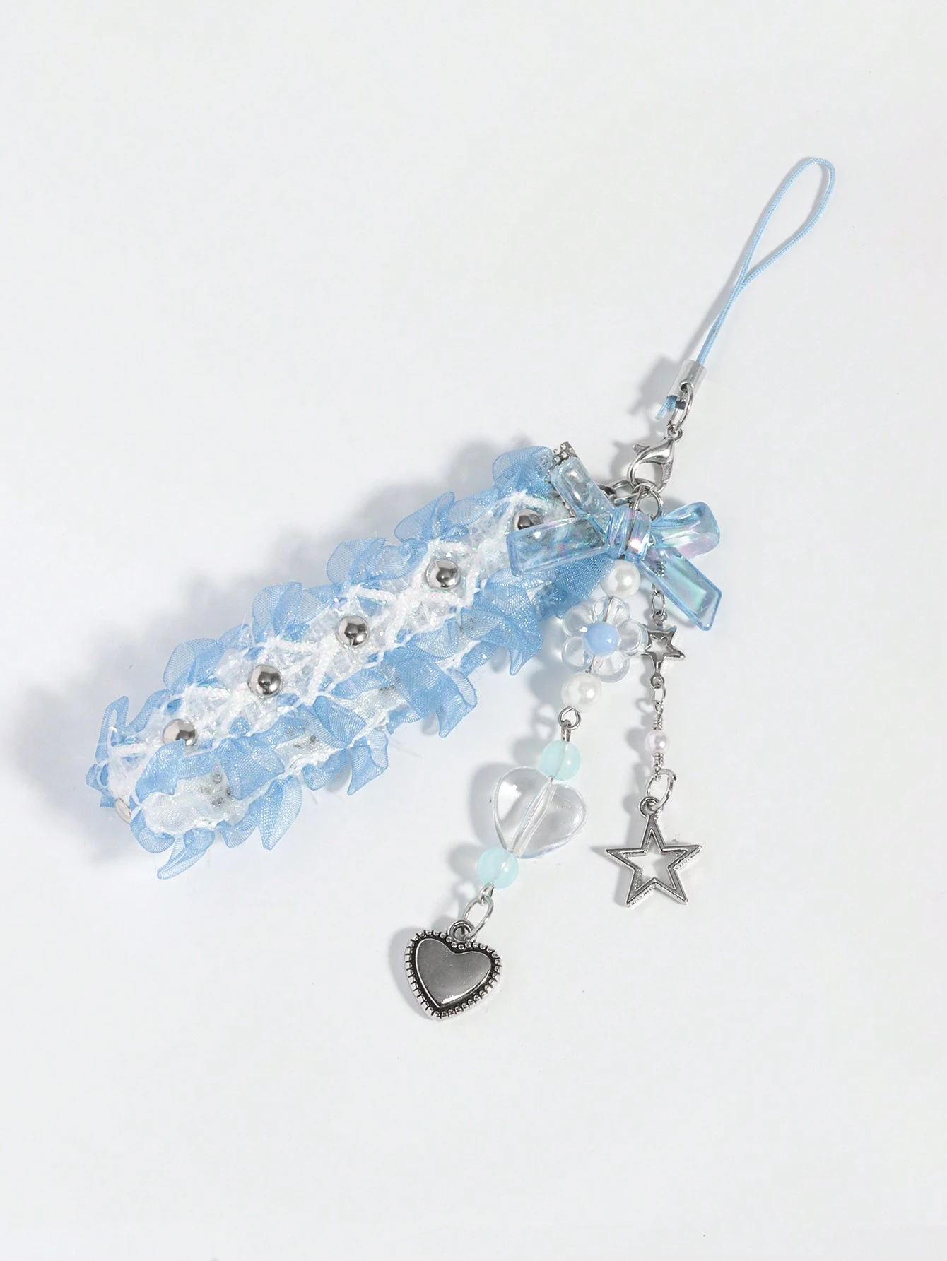 Kawaii 1 قطعة قطعة مفتاح جذابة بتصميم وردة زرقاء وكويكب مصنوعة من التول، سلسلة هاتف جوال