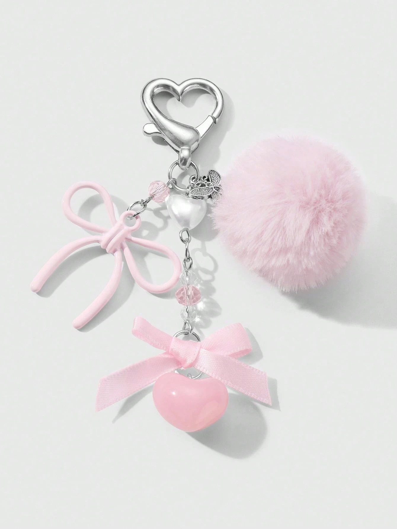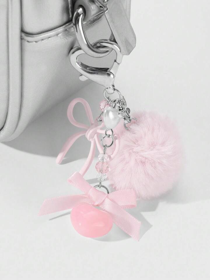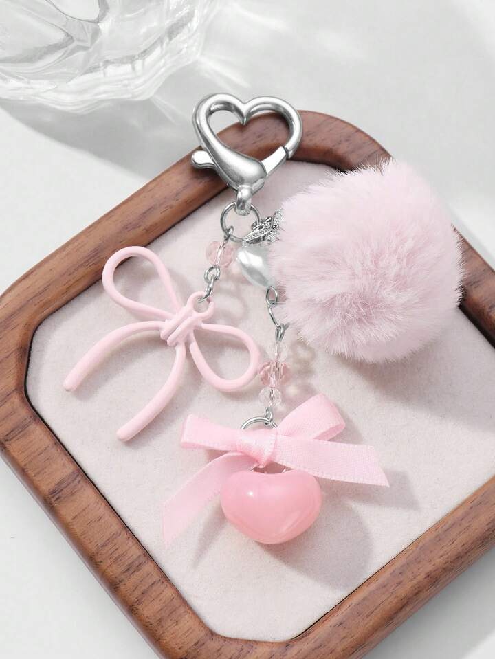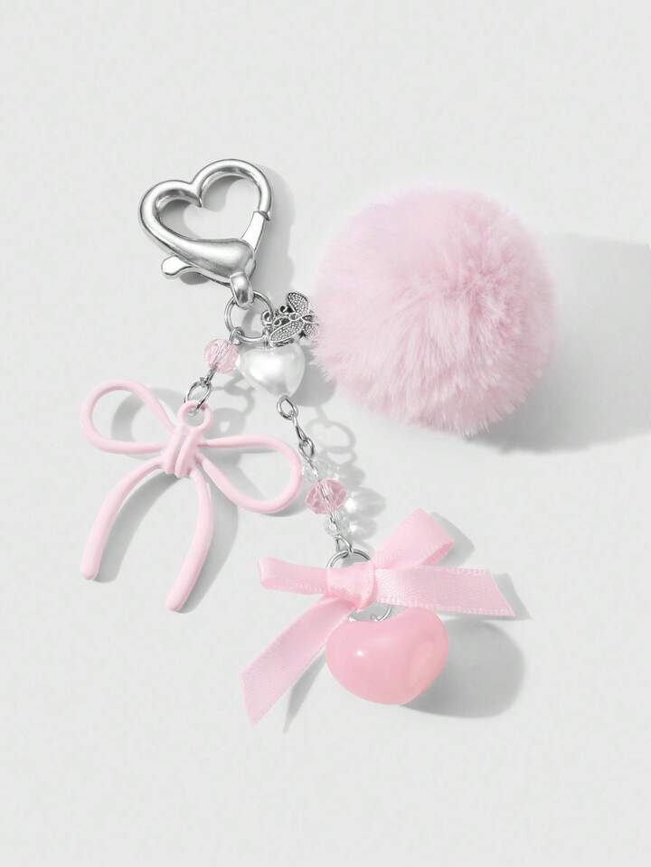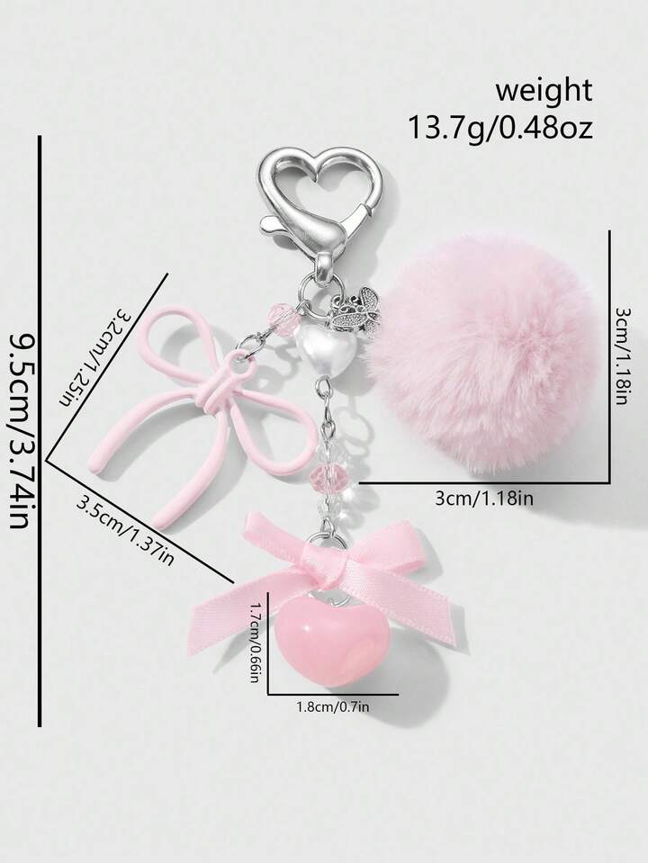 Kawaii 1 قطعة سلسلة مفتاح أنيقة وأنيقة بشكل قلب من الخرز الاصطناعي والشريط والفيونكة من الاكريليك، مناسبة للنساء، للاستخدام اليومي، هدية عيد