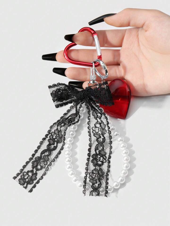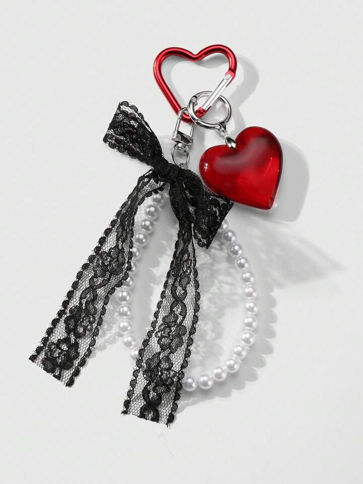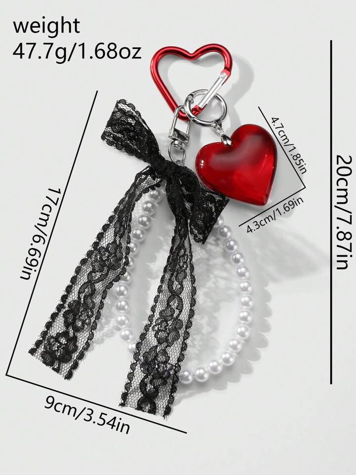 Kawaii قطعة واحدة دلاية مفتاح/تعليقة حقيبة بشكل قلب شفاف مزخرف بالخرز واللؤلؤ والشريط الطويل، أنيقة وحلوة، مناسبة للفتيات والنساء في الاستخدام اليومي