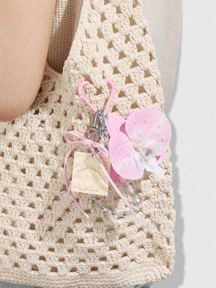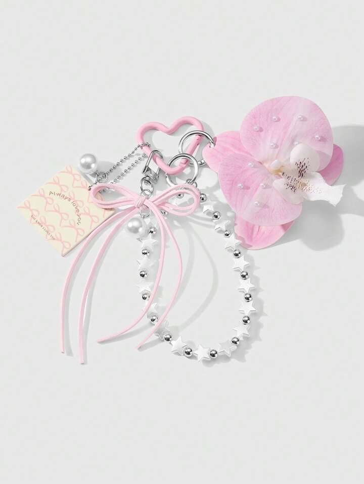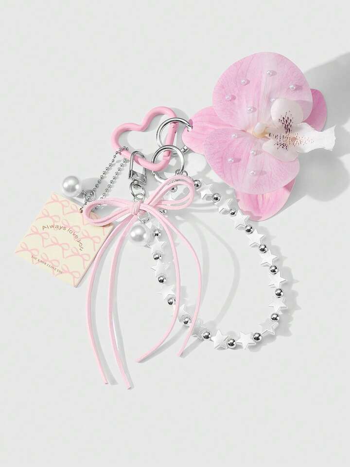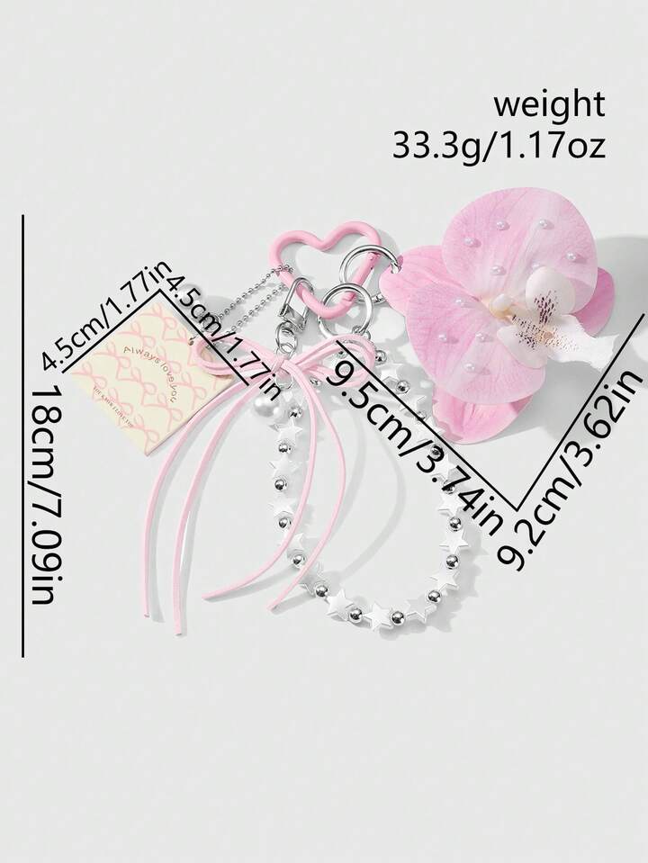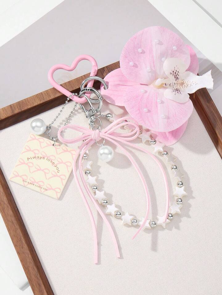 Kawaii 1 قطعة ديكور زهرة الأوركيد الوردي الفاتح الفاخر والبسيط على طراز Ins، مزين بخرز اللؤلؤ الصناعي والقوس المخملي من CCB، مناسب كسلسلة مفاتيح DIY، علاقة حقيبة، ديكور هاتف، هدية مناسبة للنساء والمناسبات الخاصة
