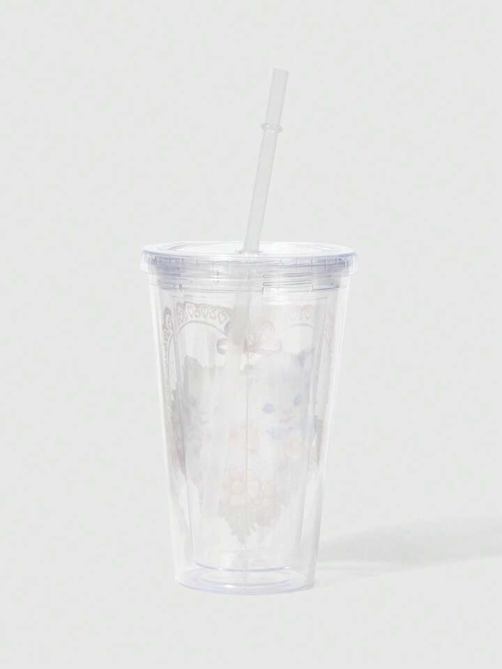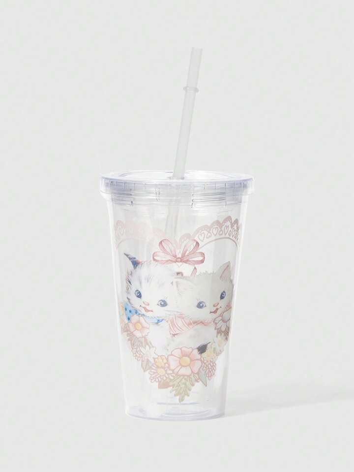 Kawaii قطعة واحدة PS كوب مسطح , كاجوال حرف قط & نمط زهري قابل للغسل زجاجة مع غطاء