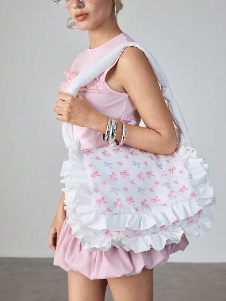 Kawaii حقيبة تسوق مع فيونكة وكشكشة باللون الوردي 1 قطعة، سعة كبيرة، مناسبة لأيام عيد الحب والمواعدة