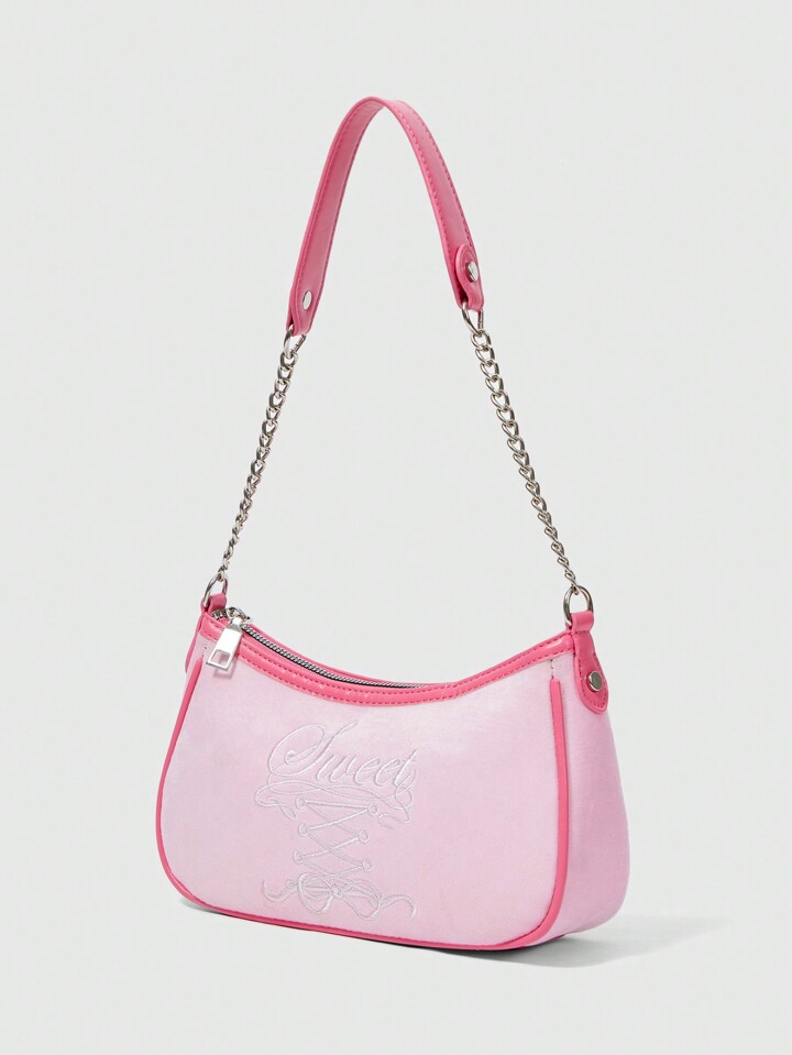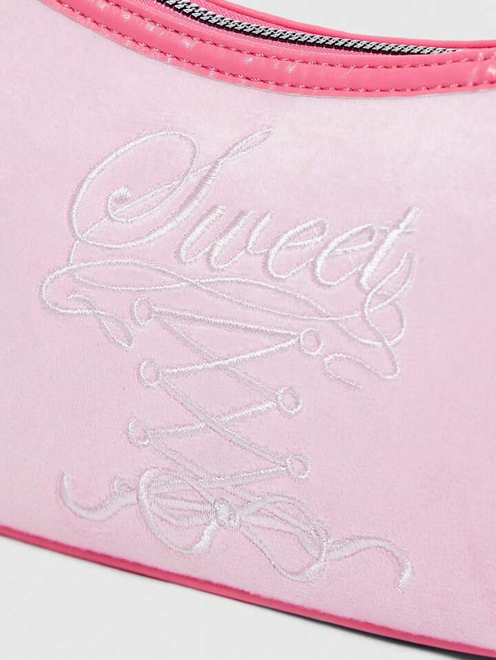 Kawaii 1 حقيبة كتف مخملية مطرزة باللون الوردي بكلمة "حلوة"، مناسبة للمواعيد في عيد الحب