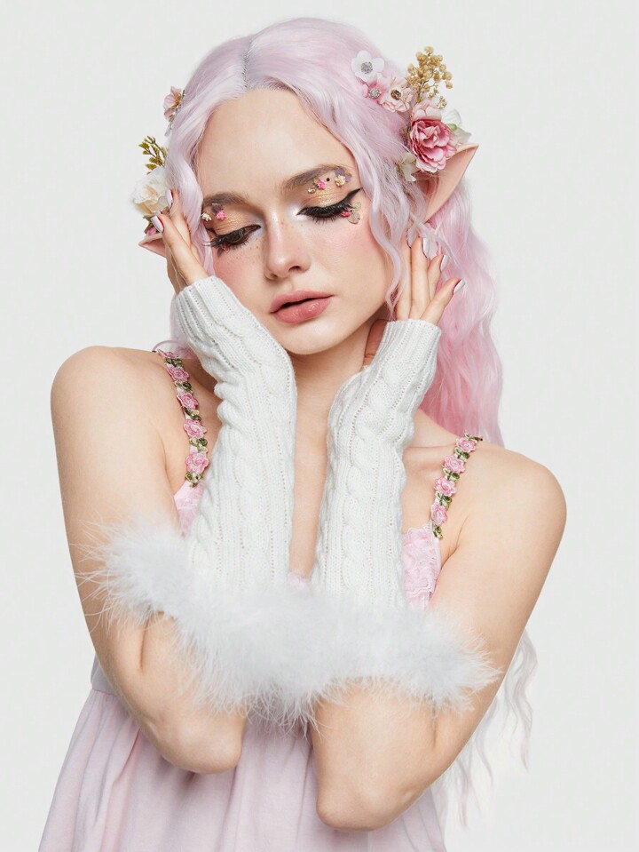 Kawaii قطعة واحدة من جهاز تدفئة الذراع المحبوك بالريش المثير مع الكفة من الدانتيل للفتيات المراهقات
