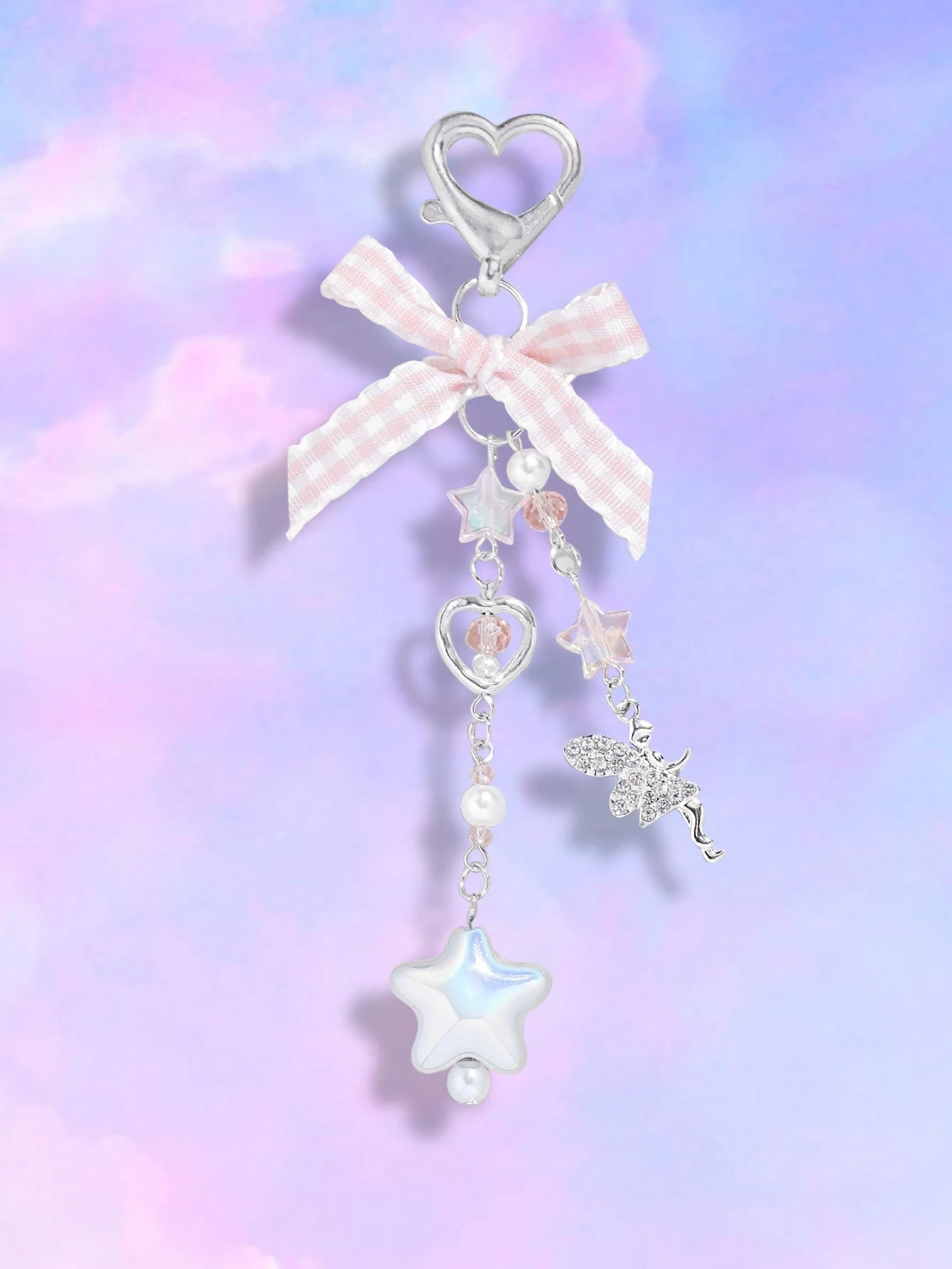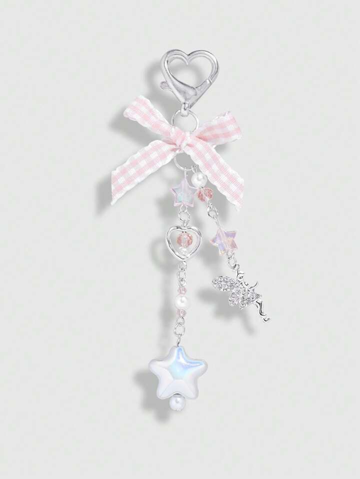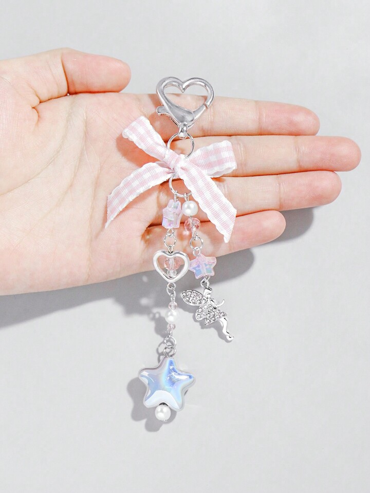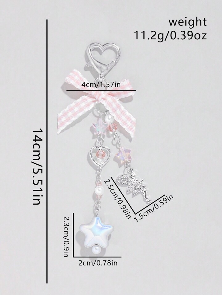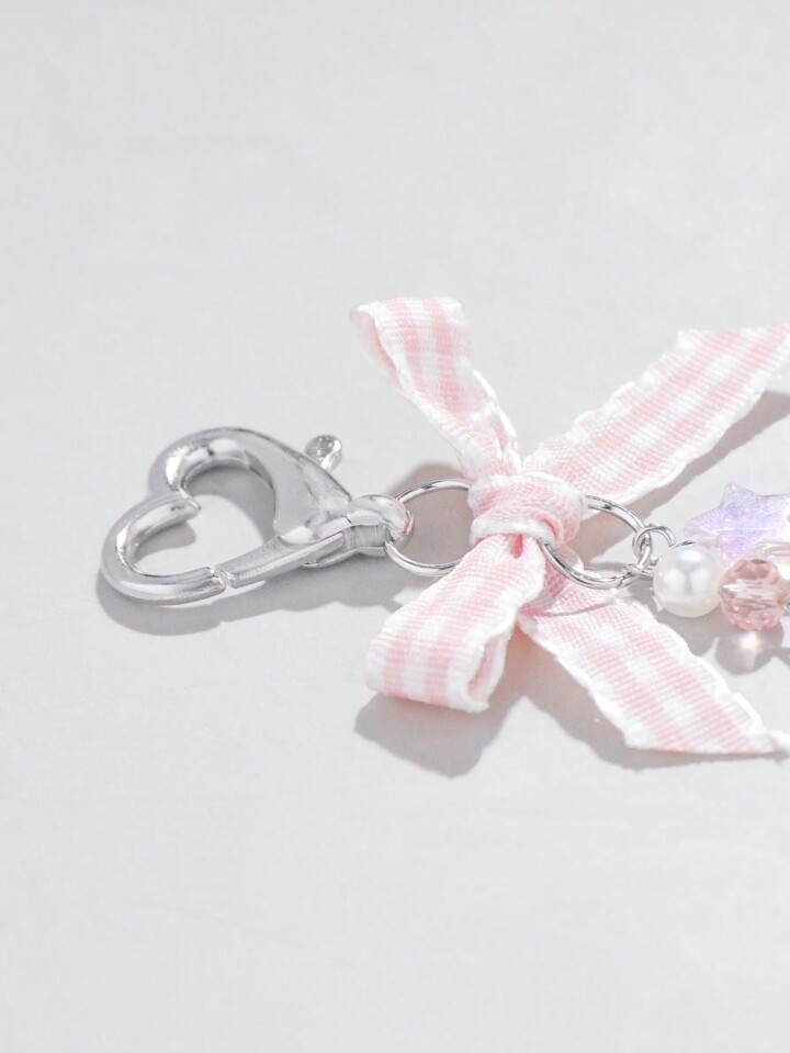 Kawaii ميدالية مفاتيح قلادة وشارم للحقيبة على شكل نجمة وقلب بلوري ولؤلؤة في تصميم فتاة مدرسية جميلة وأنيقة بنقش لون وردي مخطط على شريط محبوك، مناسبة لتزيين يومي للسيدات والطالبات وكهدية في المناسبات}