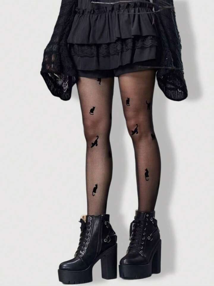 Kawaii قطعة واحدة من شراشف/جوارب طويلة/سراويل للنساء مطبوع عليها رسوم كرتونية قطة جذابة باللون الأسود