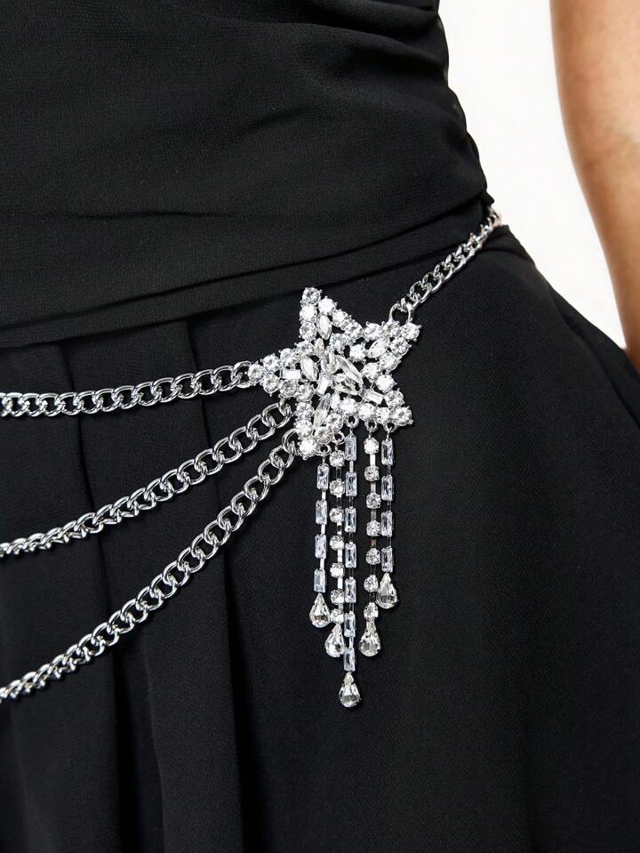 Kawaii 1 قطعة حزام سلسلة ثلاثي الطبقات للنساء ، مزخرف بنجوم من الراين الأنيقة والشرابات، إكسسوار أنيق متعدد الاستخدامات للفستان