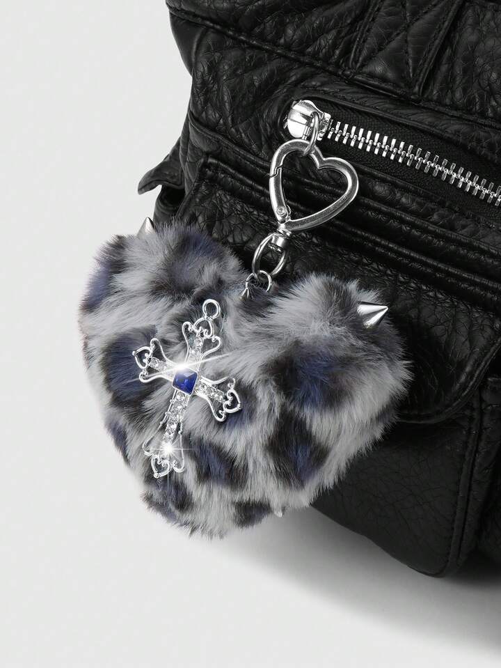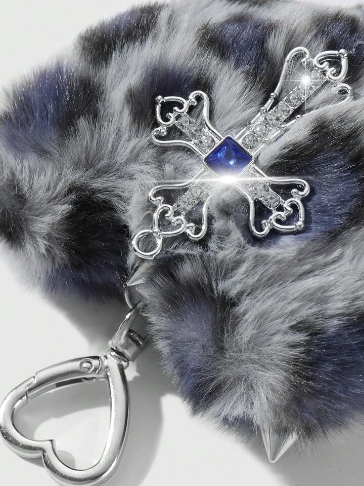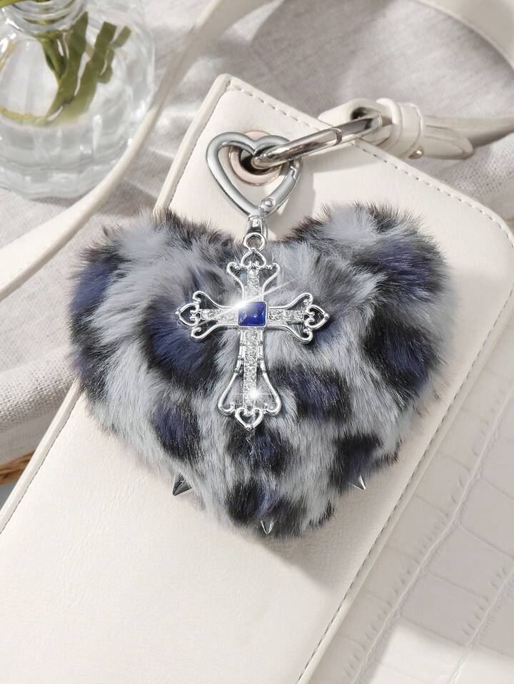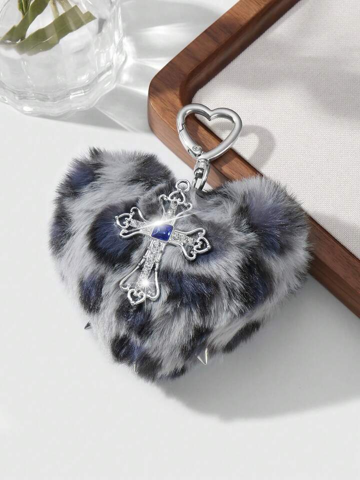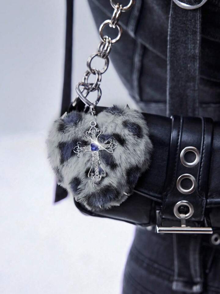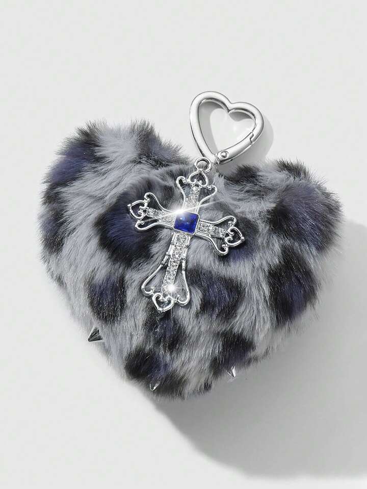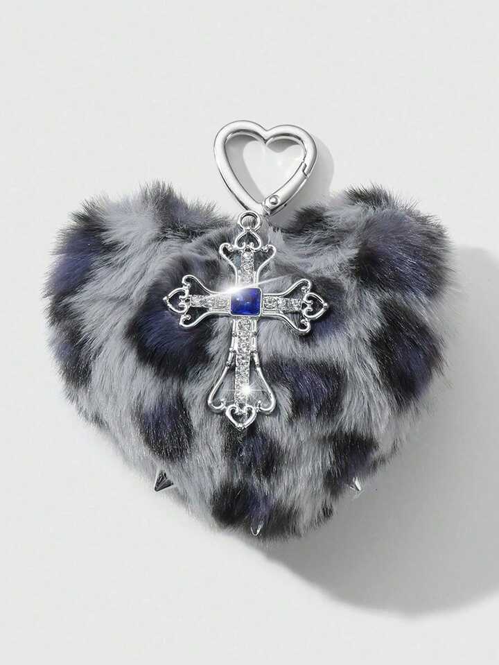 Kawaii 1 قطعة قلادة مفتاح Y2K ريترو أنيقة بنمط فرو صناعي رمادي بطبعة حيوان ومسامير وقلب كريستالي ثلاثي الأبعاد وصليب مجوف، مناسبة للنساء، للاستخدام اليومي، هدية للمناسبات