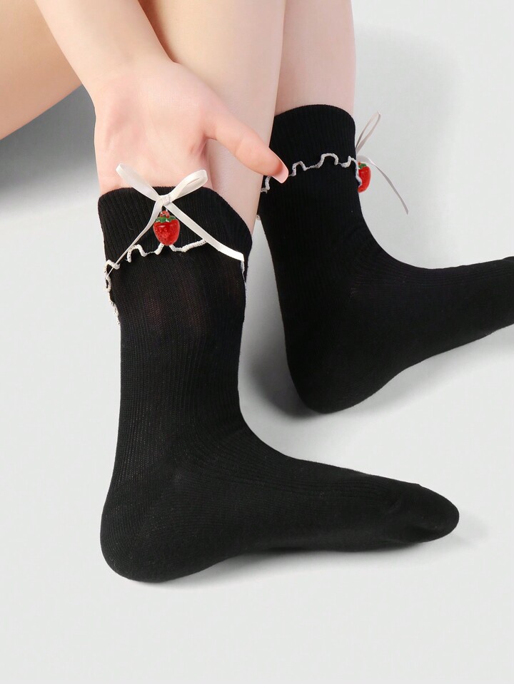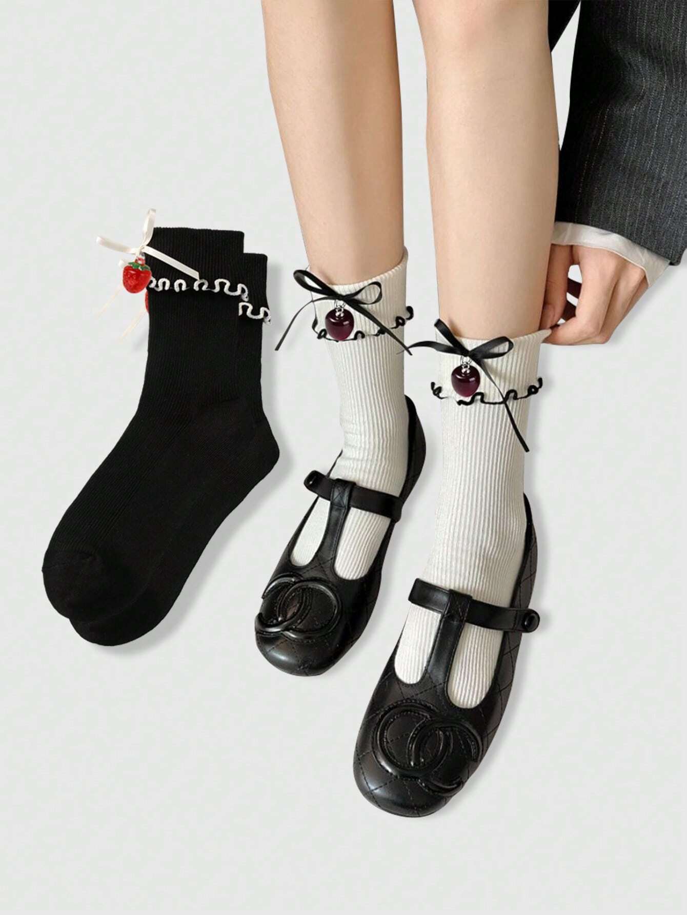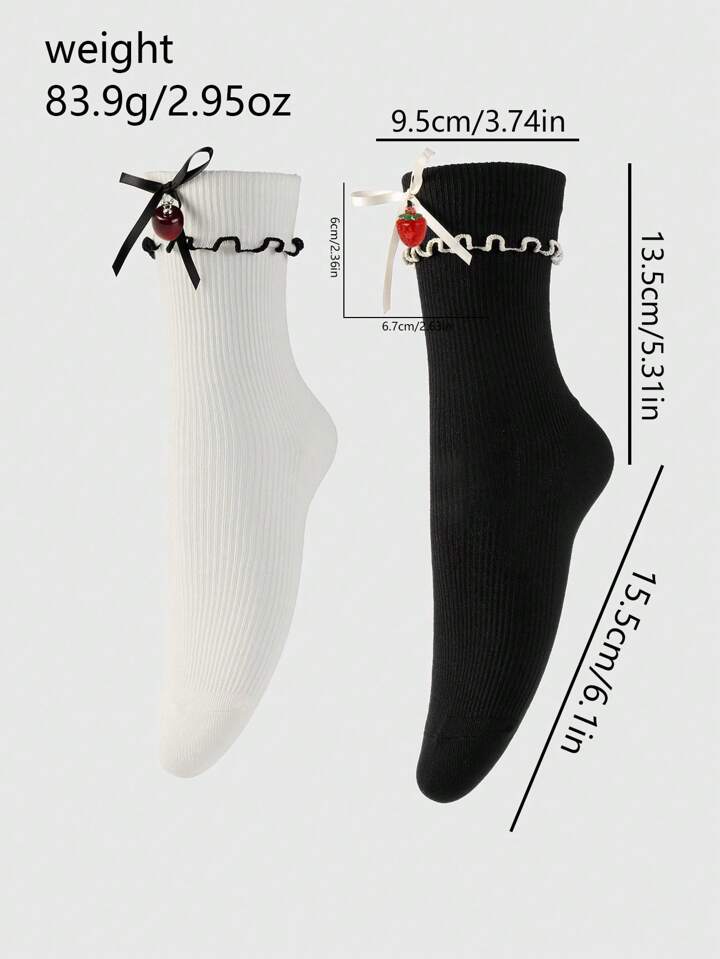 Kawaii زوجان من الجوارب الرقيقة والبسيطة على الطراز الكوري ذات الشريط الدانتيل الكشكشي بأشكال فراولة وكرز معلقة، مضادة للرطوبة ، ناعمة ودافئة باللونين الأسود والأبيض مجموعة مناسبة للنساء والفتيات في الاستخدام اليومي، في علبة هدايا
