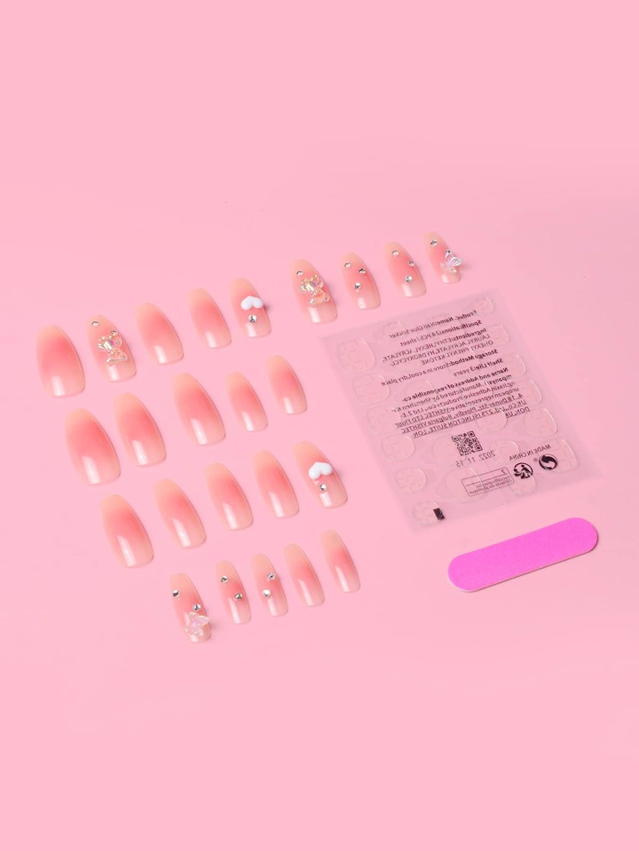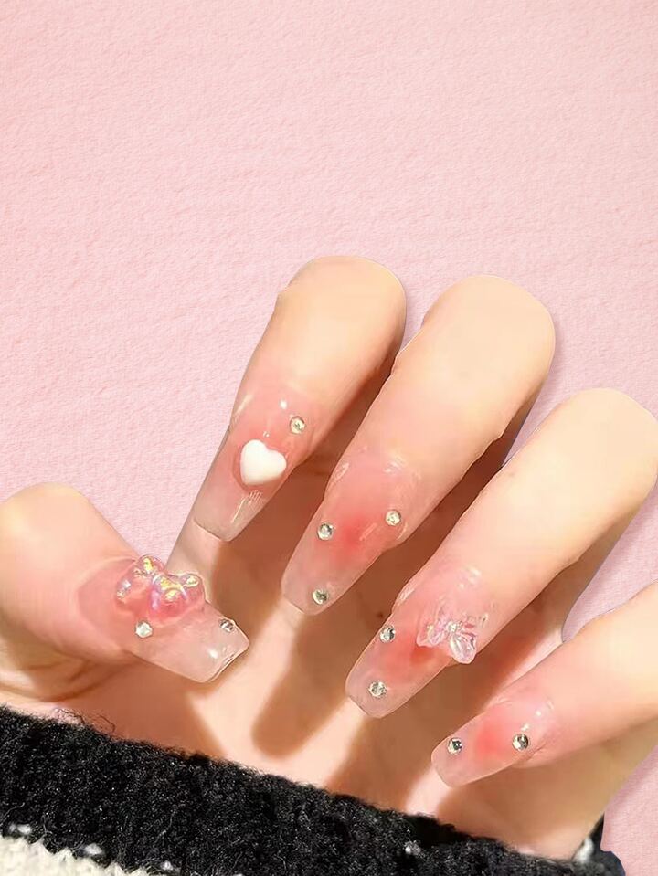 Kawaii أظافر المزيف الطويل بزخرفة حجر الراين والقلب وشكل النعش 24قطعة مع ملف الاظافر مع شريط