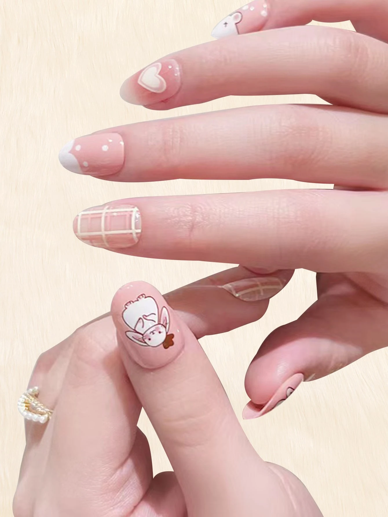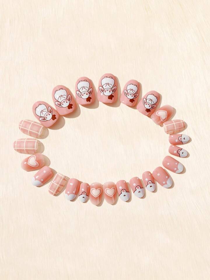 Kawaii أظافر اصطناعية قصير بيضاوي تصميم رسوم كارتون نمط الأرنب 24 قطعة