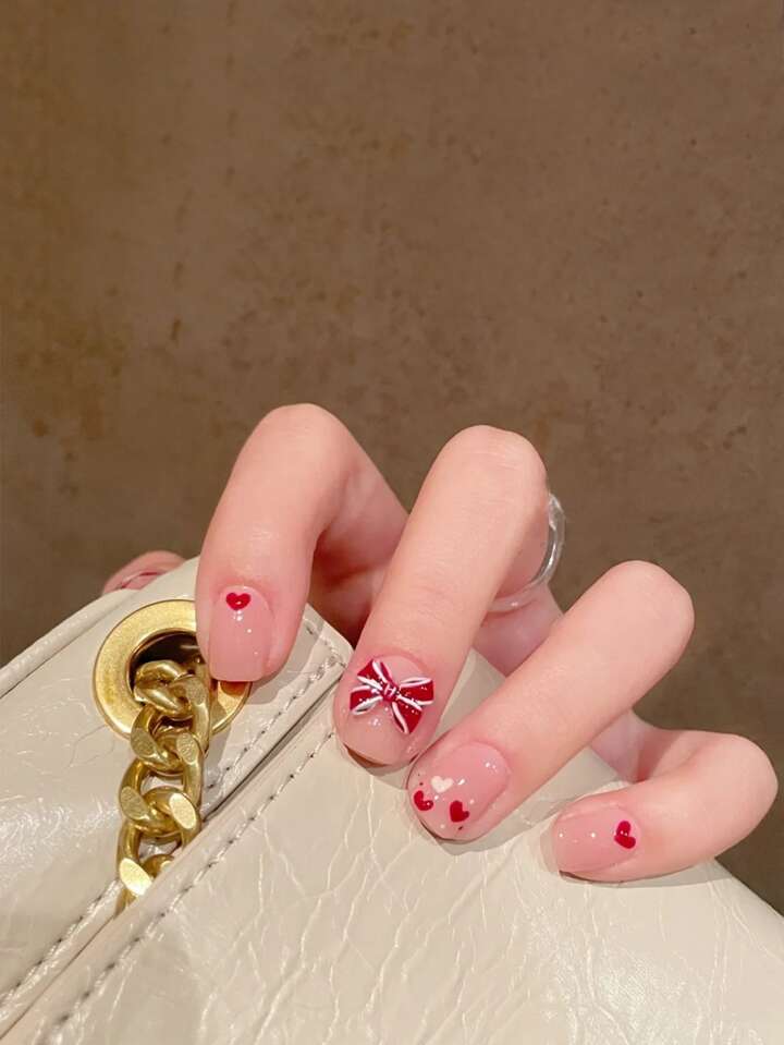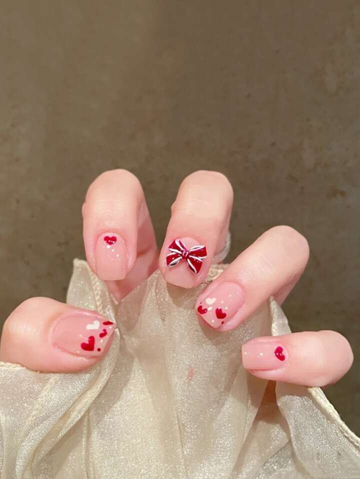 Kawaii 24 قطعة قصير مربع ثلاثي الأبعاد مزخرف بعقدة الفراشة أظافر اصطناعية و ورقة واحدة شريط